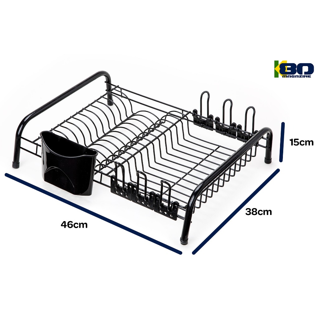 Produto ORIGINAL, fabricado no Brasil, com material resistente e durável Características: - Cor: preto - Dimensões: 46 x 15 x 38 cm - Capacidade para 12 pratos. - Capacidade para 6 copos (apoios individuais) - Com porta talheres removível - Material: Estrutura em Aço termoplastificado, pés com apoios em borracha, suporte para copos e porta talheres em resina plástica de alta resistência.