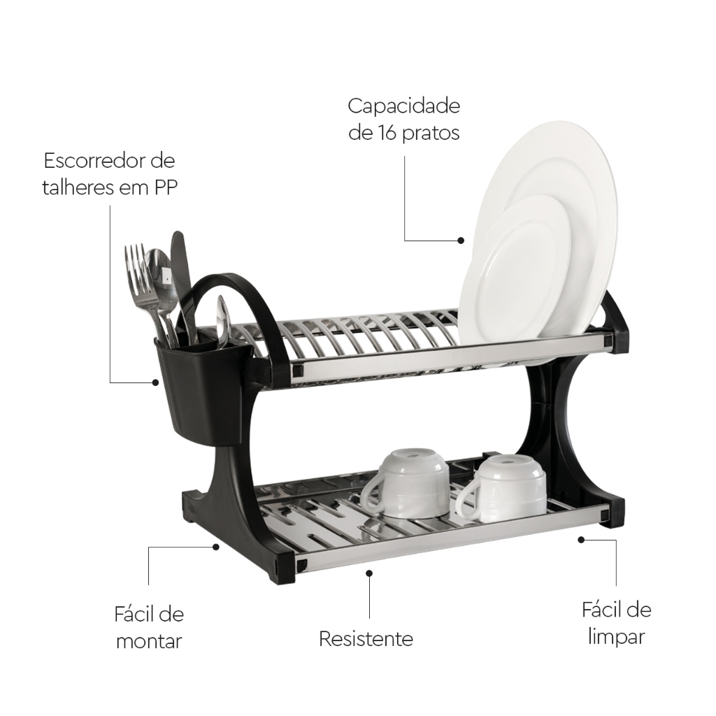 Escorredor de Louças 16 pratos Brinox Suprema - Aço Inoxidável - Com Dispenser para Detergente Preto