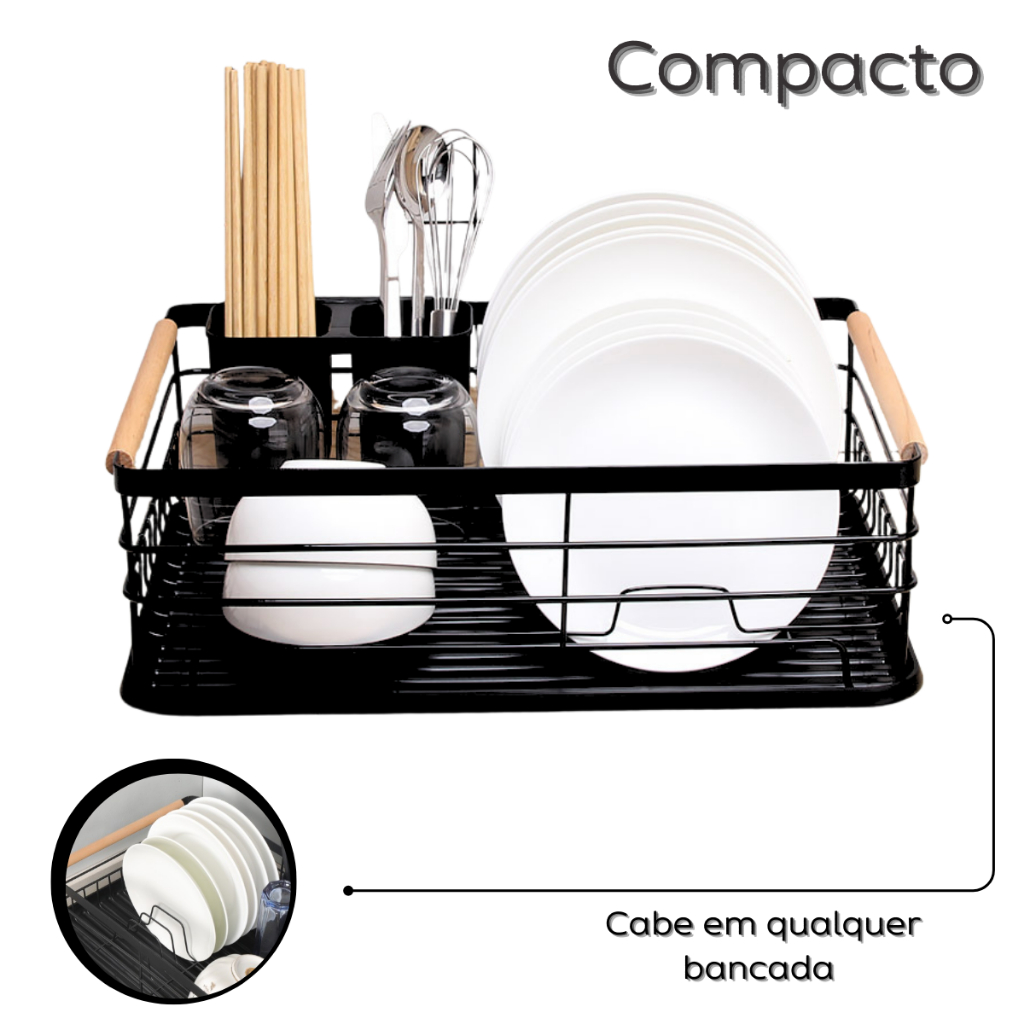 O anúncio contém: 01 Escorredor de Louças. Escorredor de Louças Moderno com Bandeja Coletora e Porta-Talheres Organize sua cozinha com praticidade e muito estilo. Esse escorredor de louças combina design moderno, resistência e funcionalidade, trazendo elegância para sua bancada sem abrir mão da utilidade no dia a dia. Benefícios Porta-talheres removível, ideal para colheres, garfos, facas e utensílios de cozinha. Bandeja coletora que evita respingos e mantém a pia sempre limpa. Capacidade para pratos, copos, tigelas e talheres de forma organizada. Pegadores laterais em madeira, que dão charme e facilitam o manuseio. Design minimalista, perfeito para cozinhas modernas. Ficha Técnica Material: Aço com acabamento preto e detalhes em madeira. Bandeja: Plástica, removível e fácil de limpar. Porta-talheres: Incluso, removível. Capacidade: até 10 pratos, 6 copos e diversos talheres. Dimensões aproximadas (AxLxC): 14,5 cm x 30,5 cm x 44 cm. Cor: Preto fosco com detalhes em madeira Fabricante: Brinqlar. Indicado para: Cozinhas modernas e organizadas. Quem busca praticidade sem abrir mão do design. Presentear em casamentos, chá de cozinha e inauguração de casa nova. - Produto novo e em estoque. - Todos os produtos têm seguro contra extravio. - As cores do produto podem variar de acordo com o lote de fabricação. - Todas as informações são de responsabilidade do fabricante e/ou fornecedor.
