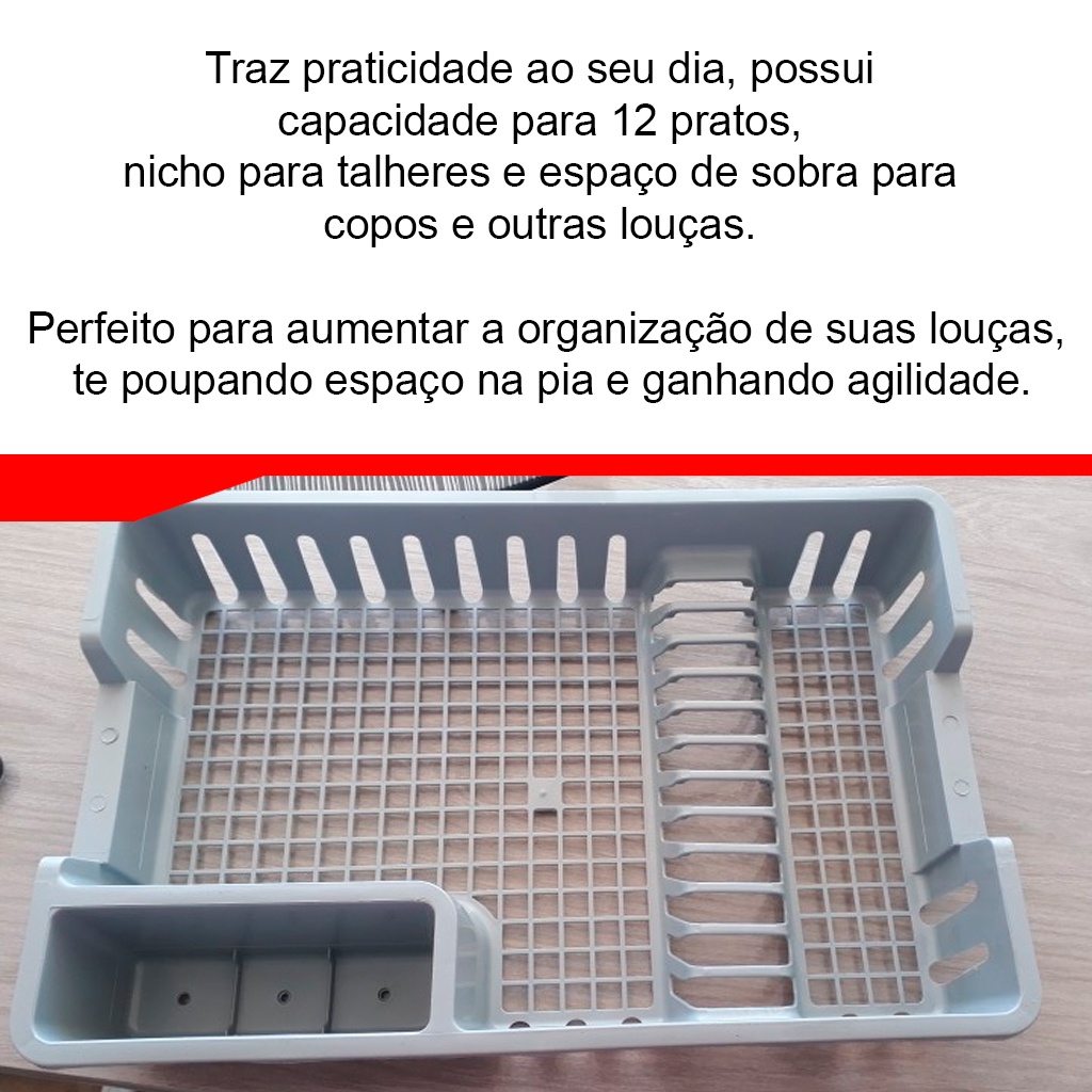 COMERCIAL VIPASA DISTRIBUIDORA. Escorredor De Louças Plástico Grande Porta Talheres Pratos Copo Simples Organizar Secar Louças Descrição Do Produto Escorredor de Louças Plástico Porta Talheres Pratos Copo Em Geral Com design bonito e moderno, o escorredor de louça foi pensado para facilitar o dia a dia na cozinha, traz uma decoração ao ambiente muito mais sofisticada, otimização e organização para sua pia ou bancada. Traz praticidade ao seu dia, possui capacidade para 12 pratos, nicho para talheres e espaço de sobra para copos e outras louças. Perfeito para aumentar a organização de suas louças, te poupando espaço na pia e ganhando agilidade. PERGUNTAS FREQUENTES: 1- Qual a capacidade do escorredor? R: Possui capacidade para 12 pratos, além do nicho para talheres e o espaço para copos e demais louças. 2- Acumula água no escorredor ou nicho de talheres? R: Não! O escorredor possui o fundo vasado para a água não acumular. 3- O material é resistente? R: Sim! O material é de alta resistência e durabilidade. CARACTERÍSTICAS: Material: Polipropileno (PLÁSTICO) Capacidade: 12 pratos Altura: 8,0 cm Largura: 29,0 cm Comprimento: 44,0 cm Peso: 0.1 kg Cor: Cinza Claro COMERCIAL VIPASA DISTRIBUIDORA.