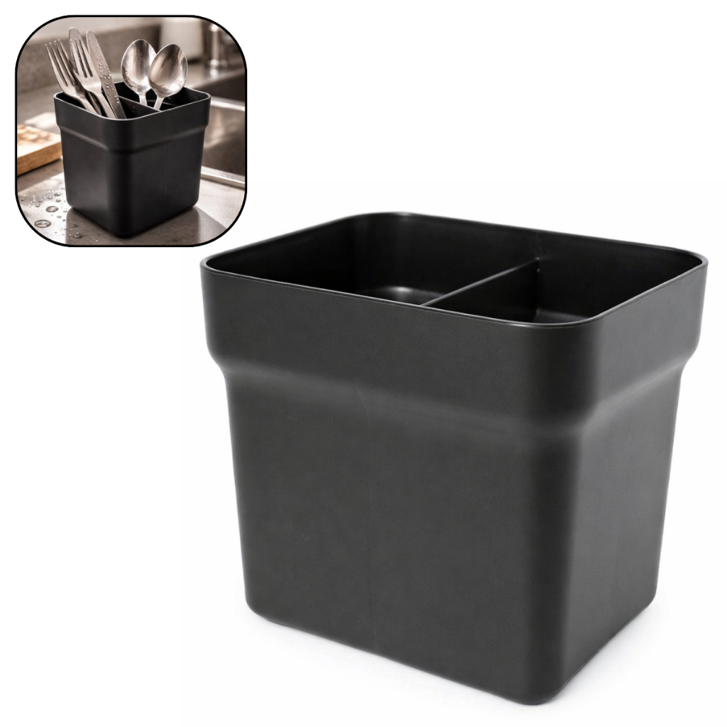 O Escorredor de Talheres com 2 Divisórias é a solução ideal para manter seus talheres organizados e corretamente posicionados para secagem após a lavagem. Com design funcional e compacto, otimiza o espaço da pia e contribui para uma rotina mais prática na cozinha._x000d_ _x000d_ Fabricado em polipropileno reciclado (PP) de alta resistência, oferece durabilidade, fácil higienização e excelente desempenho no uso diário._x000d_ _x000d_ Características do Produto_x000d_ _x000d_ 2 divisórias internas para melhor organização dos talheres_x000d_ _x000d_ Design funcional e compacto_x000d_ _x000d_ Estrutura resistente à umidade_x000d_ _x000d_ Fácil limpeza e manutenção_x000d_ _x000d_ Cor: Preto_x000d_ _x000d_ Especificações Técnicas_x000d_ _x000d_ Material: Polipropileno Reciclado (PP)_x000d_ _x000d_ Comprimento: 14 cm_x000d_ _x000d_ Largura: 10,5 cm_x000d_ _x000d_ Altura: 12 cm