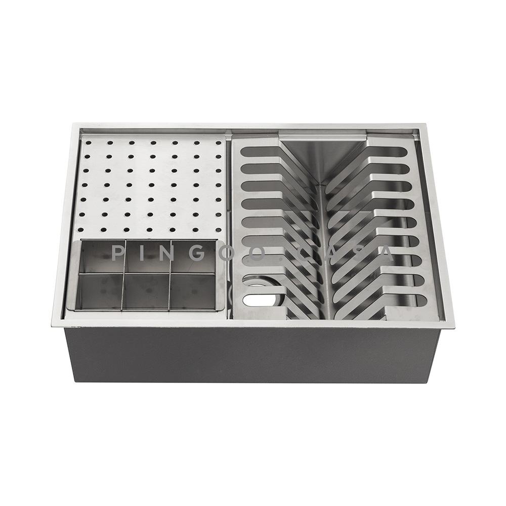 O novo Escorredor de Louças Embutido Pingoo trará um ar de sofisticação e elegância para sua cozinha ou área gourmet. Produzido em Aço Inox 304, o escorredor é eficiente e moderno, trazendo personalidade e beleza para sua casa. O produto é utilizado para suporte de louças, talheres, e utensílios de cozinha após a lavagem. A instalação é simples, podendo ser embutido em pias de granito, madeira, cimento, entre outras superfícies da área desejada. O escorredor direciona a água escoada direto para o cano através de um dreno no centro inferior da peça. Podendo conectá-lo no sifão da cuba ou em um ponto independente. Não acompanha louças, talheres, etc. Especificações: Marca: Pingoo Material: Aço Inox 304 Espessura: 1.2mm Acabamento: Escovado Cor: Prata Aplicação: Embutir Indicação: Cozinha, Ilha, Área Gourmet Acompanha Acessórios: 4 Grades de apoio Recomendações de Uso: Esta peça contém bordas cortantes. Manusear com cuidado. Não usar ácido muriático, água sanitária ou qualquer outro solvente para lavar objetos na peça. Na reforma ou construção, proteger o escorredor para não deixar sobre o mesmo pó de cimento ou gesso. Enxaguar e secar bem a peça após o uso. Nunca deixar objetos metálicos sobre a peça por períodos muito longos, para evitar a corrosão. Para manter o brilho da sua pia, recomendamos o uso da pasta para polir e remover manchas em superfícies de aço inoxidável. Itens inclusos: 1 Escorredor Embutido Para Cozinha Gourmet Pingoo - Prata 4 Módulos de suporte
