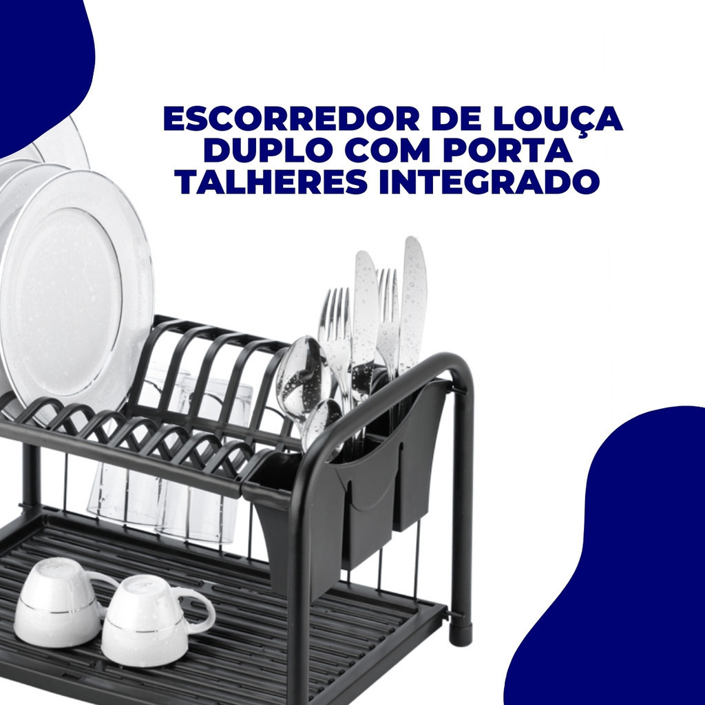 Escorredor Organizador Louça Pia Cozinha Bancada Duplo Pratos Talheres Copos Compacto Preto Arthi