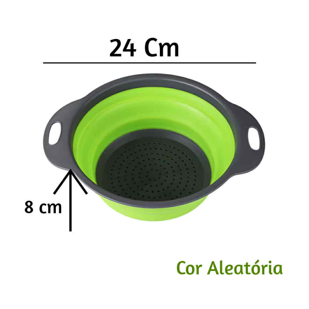 AS MEDIDAS ESTÃO NAS IMAGENS DO PRODUTO. Escorredor Retrátil de Silicone Dobrável – Praticidade para Macarrão, Legumes e Verduras O Escorredor Retrátil de Silicone com 24cm é ideal para quem busca praticidade e economia de espaço na cozinha. Perfeito para escorrer massas, legumes, verduras e alimentos em geral, ele é dobrável, leve e fácil de manusear. Fabricado em silicone e plástico (polipropileno) reforçado, o escorredor é altamente resistente, suportando tanto altas quanto baixas temperaturas. Suas alças laterais proporcionam segurança e firmeza durante o uso. ✅ Especificações do Produto: Material: Silicone com plástico (PP) reforçado Resistência térmica: Suporta altas e baixas temperaturas Alças laterais: Apoio firme e seguro Design retrátil: Dobrável, leve e fácil de guardar 📏 Dimensões: Altura (aberto): 7,5 cm Altura (dobrado): 2,5 cm Diâmetro externo: 18 cm Um item indispensável na cozinha, ideal para quem deseja funcionalidade sem abrir mão de espaço e organização. Adquira agora o seu escorredor retrátil e otimize sua rotina na cozinha!