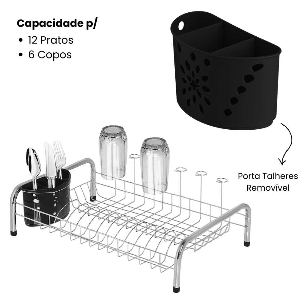 1 Secador de Louças Rainha Com Porta Copos e Talheres – N379 Organize sua cozinha com praticidade e estilo com o Secador de Louças Rainha. Com design moderno e funcional, ele possui espaço que acomoda até 12 pratos e 6 copos, além de um amplo espaço para tigelas e demais utensílios. O escorredor conta ainda com um porta talheres removível, equipado com tela escorredora e 3 divisórias, garantindo a separação e o escoamento ideal da água. Fabricado com estrutura em aço cromado de alta resistência, o escorredor Niquelart une durabilidade, leveza e acabamento sofisticado, valorizando o ambiente da sua cozinha. Perfeito para residências que precisam de soluções inteligentes de organização sem abrir mão de um design elegante. Características Principais: Altura: 18 Cm Comprimento: 51,5 Cm Largura: 35 Cm Peso: 1Kg Material: Aço Cromado e Porta Talheres em Polipropileno Marca: Niquelart
