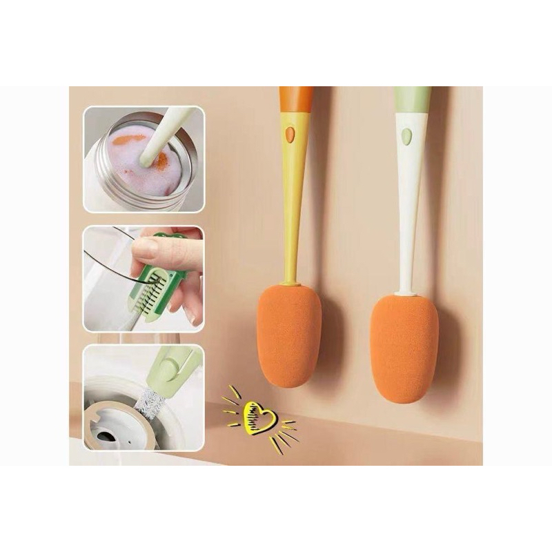 Escova 3 Em 1 De Limpeza De Copo e garrafas Com Cabo Longo Multifuncional Forma De Cenoura Especificação: - Cabeça de Esponja para lavar o interior do copo/ garrafa - Escova intermediária para lavar o interior da tampa - Escova de borracha para lavar a boca de copo. em formato de U - Alça estendida de 28 cm que permite se usado para copos e garrafas mais fundas Utilização: - Para lavar qualquer tipo de copo como copo de vidro, caneca, xicara, etc - Tem 3 funções pra ajudar lavar o copo