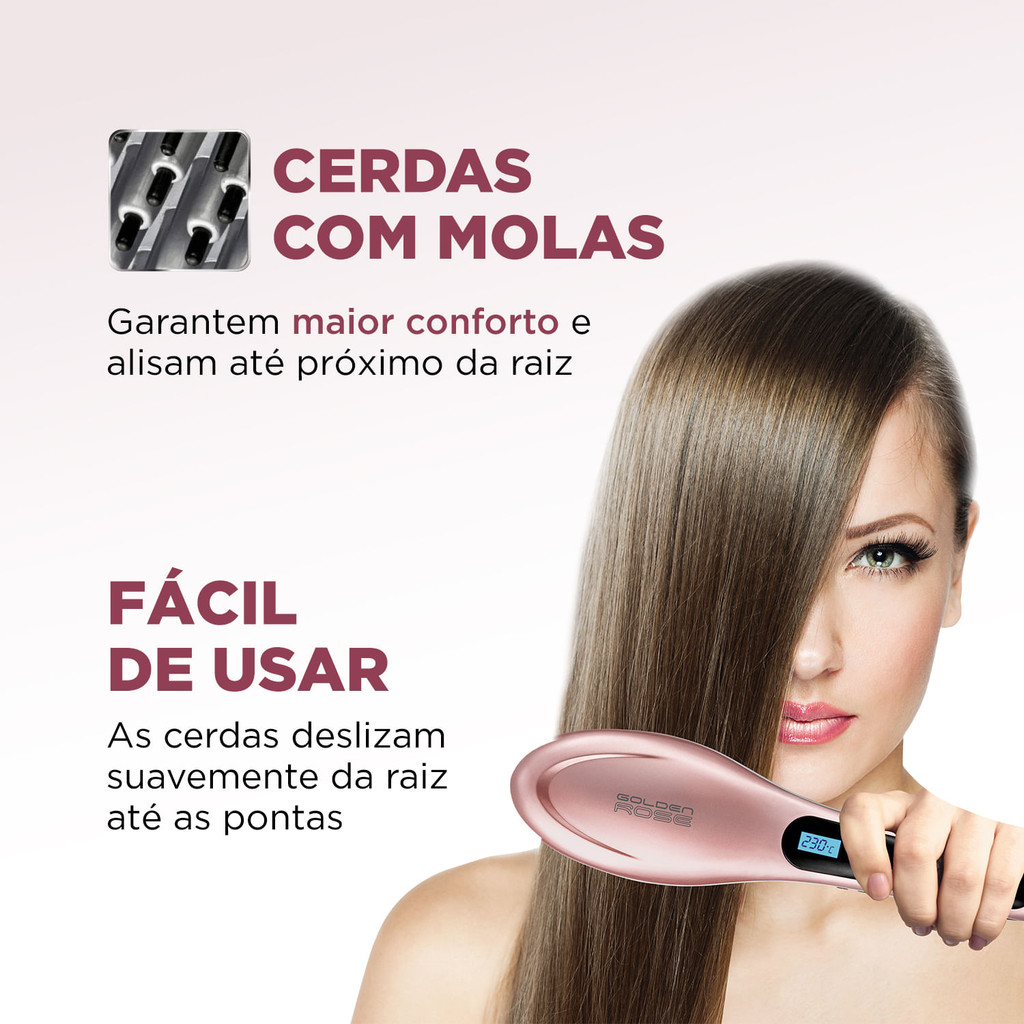 Conforto e praticidade para um liso perfeito! As cerdas com molas presente na Escova Alisadora Golden Rose EA-02, garante um alisamento eficaz da raiz até as pontas. As placas de cerâmica revestidas com Tourmaline Íon, garantem um alisamento perfeito e libera íons que reduzem o frizz, proporcionando um liso macio e com muito brilho. Saiba mais sobre a EA-02 da Mondial: BASE CERÂMICA COM TOURMALINE ÍON: Com o calor, o mineral emite íons negativos que fecham as cutículas dos fios e reduzem o frizz. Seu cabelo fica mais brilhante e macio! CERDAS COM MOLAS: Garantem maior conforto e alisam até próximo da raiz. DISPLAY DIGITAL COM CONTROLE DE TEMPERATURA: Permite ajustar a temperatura de acordo com o tipo de cabelo e o resultado desejado. Garante mais facilidade durante o uso. CABO GIRATÓRIO: O cabo-plugue gira 360, garantindo mais autonomia de movimento. FÁCIL DE USAR: Selecione a temperatura e aguarde o aquecimento. Escove os cabelos mecha a mecha da raiz até as pontas. BIVOLT: Pode ser usada em ambas voltagens: 127V e 220V. Liberdade de usar sua escova em qualquer lugar! ACOMPANHA NECESSAIRE: Perfeito para ser levada em viagens, academias e onde quiser. UM ANO DE GARANTIA MONDIAL: A Mondial é a escolha de milhões de consumidores. Mondial, a escolha inteligente!