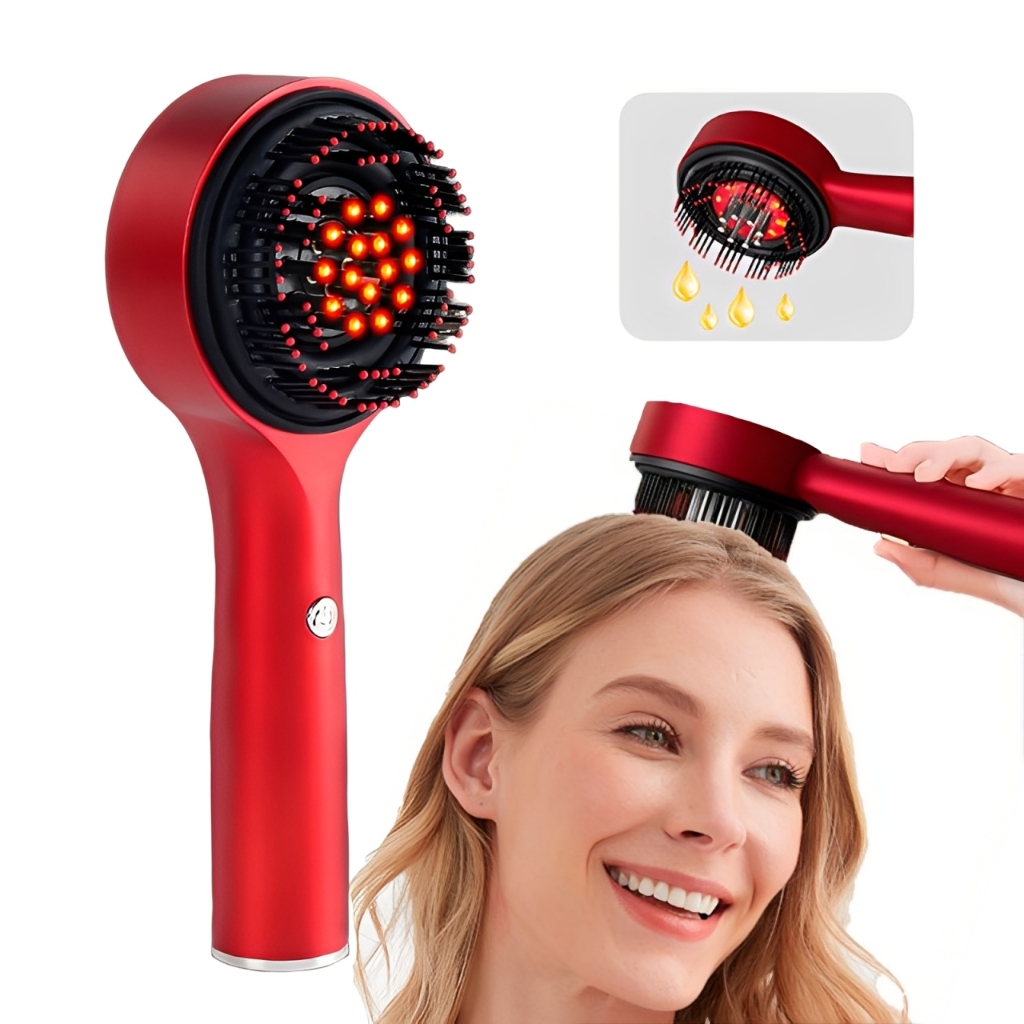 Escova Massageadora Capilar Elétrica com Aplicador de Óleo Luz Vermelha ENVIO EM COR ALEATÓRIA. A escova perfeita para quem busca praticidade e cuidado com a saúde capilar. Multifuncional, ela massageia, aplica óleo e trata os fios com luz vermelha, tudo em um só aparelho. Conta com 3 modos de massagem elétrica que ajudam a estimular os folículos capilares, favorecendo o crescimento de fios mais fortes e saudáveis. A luz vermelha fortalece os cabelos, reduz a queda, o frizz e melhora a saúde do couro cabeludo. Destaques do produto: Aplicação de óleos diretamente na raiz 3 tipos de massagem elétrica Luz vermelha terapêutica para fortalecimento capilar Pode ser usada a seco ou durante o banho Design ergonômico e fácil de usar Especificações Técnicas: Voltagem: 3.7V Potência: 5W Bateria: 1400mAh Para Ligar: Mantenha o botão pressionado por alguns segundos. Tempo de recarga: até 3 horas Autonomia: até 2 horas de uso contínuo Carregamento via USB Tipo-C Dimensões: 212 x 85 x 50 mm Itens inclusos: 1x Escova de tratamento capilar 1x Cabo USB para carregamento Tecnologia, bem-estar e beleza em um só produto. Ideal para sua rotina de autocuidado.