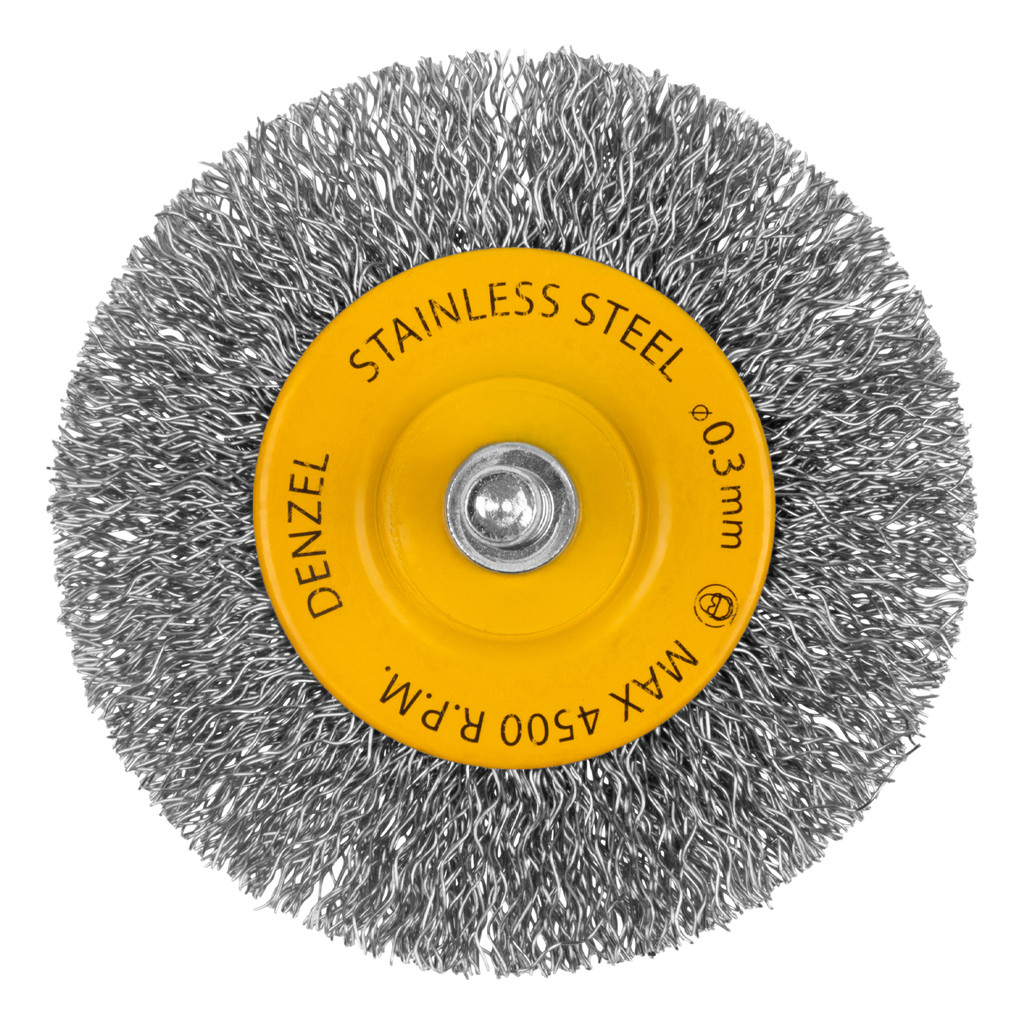 ESCOVA CIRCULAR 75 MM, COM HASTE DE 1/4 6 MM, FIOS ONDULADO INOX DE 0,3 MM/DENZEL