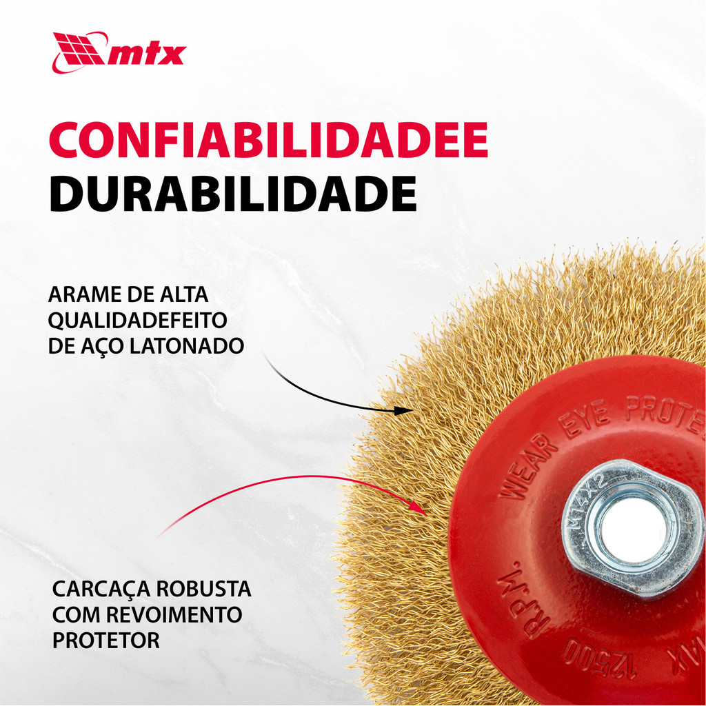 A Escova de Aço Carbono Latonada Circular MTX 746169 redefine a excelência em ferramentas de acabamento e limpeza de superfícies, apresentando uma combinação perfeita de design avançado e funcionalidade de alto nível. Com um diâmetro impressionante de 125 mm e cerdas de fio torcido, esta escova robusta vem equipada com uma rosca M14, ideal para ser acoplada ao eixo de rebarbadoras, e é capaz de sustentar uma velocidade de rotação otimizada de até 12500 rpm. Projetada para o tratamento delicado de superfícies, a Escova de Aço Carbono Latonada Circular MTX 746169 é especializada na remoção eficiente de finas camadas de ferrugem, revestimentos de tinta e sujeira, garantindo a preservação da qualidade do material subjacente. Sua forma circular universal é excepcionalmente adequada tanto para a limpeza de cantos quanto para o tratamento de superfícies planas, proporcionando uma aplicação versátil e abrangente. Vantagens da Escova de Aço Carbono Latonada Circular MTX 746169: Alta Durabilidade: Fabricadas com Arame de Aço carbono de alta qualidade, as cerdas desta escova garantem uma resistência notável ao desgaste. Esta durabilidade excepcional assegura uma vida útil extensa da escova, mesmo sob condições de uso intensivo, representando uma opção econômica e eficiente para profissionais e entusiastas do DIY. Versatilidade: Demonstrando uma adaptabilidade impressionante, a Escova de Aço Carbono Latonada Circular MTX 746169 é capaz de processar eficazmente uma ampla gama de materiais sólidos. Desde metal e madeira até metais coloridos e plástico, esta escova ajusta-se perfeitamente a diferentes tipos de superfícies, tornando-se um instrumento indispensável para diversos projetos de limpeza, preparação de superfície e restauração. Proteção Contra Danos: Com cerdas latonadas e um corpo revestido com esmalte protetor, esta escova oferece uma resistência superior à corrosão. Tal proteção não apenas mantém a integridade da escova ao longo do tempo, mas também assegura a proteção das superfícies tratadas contra potenciais danos durante o processo de limpeza e acabamento. a Escova de Aço Carbono Latonada Circular MTX 746169 emerge como a solução perfeita para aqueles que procuram uma ferramenta potente, durável e altamente versátil para o aprimoramento e limpeza de superfícies. Seu design inovador e materiais de primeira linha garantem um desempenho excepcional na remoção de impurezas e na preparação de superfícies para os passos subsequentes de qualquer projeto, assegurando resultados de alta qualidade e eficiência incomparável.