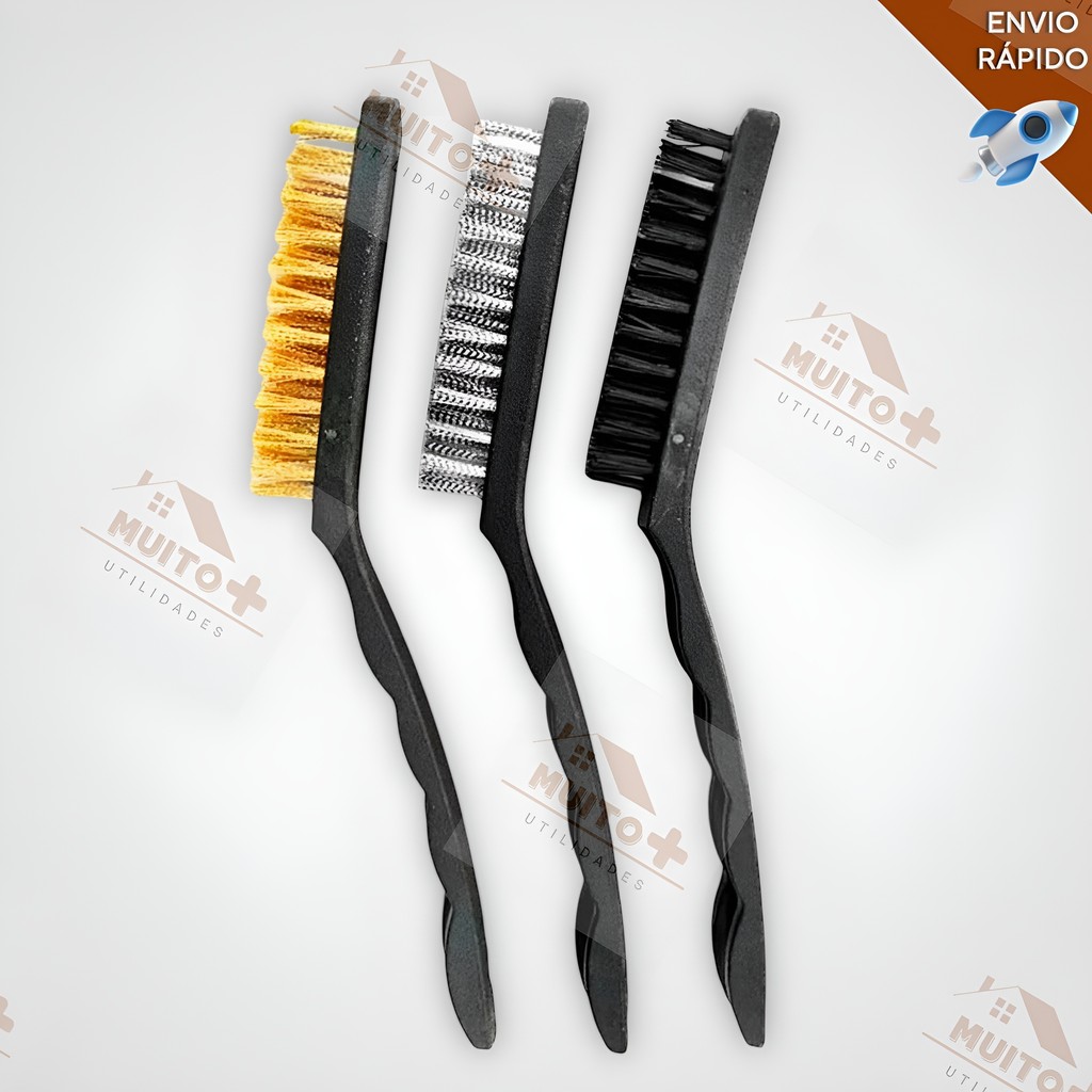 DESCRIÇÃO DO PRODUTO - Jogo de Escovas de Aço Carbono manuais - Cabo de plástico ergonômico - Desenvolvidas para trabalhos de rebarbação, limpeza, polimento e pequenas partes metálicas. Conteúdo: 1 - Jogo de Escovas Manuais c/ 3 Peças OU 2 - Jogo de Escovas Manuais c/ 6 Peças OU 3 - Jogo de Escovas Manuais c/ 9 Peças ESPECIFICAÇÃO TÉCNICA - Escova Grande - Fabricado em latão, nylon e aço carbono - Cabo Ergonômico - Altura: 22cm - Largura: 2cm - Escova pequena - Fabricado em latão, nylon e aço carbono - Cabo Ergonômico - Altura: 18 cm - Largura: 1 cm ******** ATENÇÃO A VARIAÇÃO DE ÍTENS, SELECIONAR CORRETAMENTE A QUANTIDADE QUE DESEJA...OBRIGADO E BOAS COMPRAS!! *********** *** TODOS OS PRODUTOS SERÃO ENVIADOS EM ATÉ 24HRS ÚTEIS APÓS A CONFIRMAÇÃO DE PAGAMENTO ***** OBRIGADO PELA PREFERÊNCIA, BOAS COMPRAS