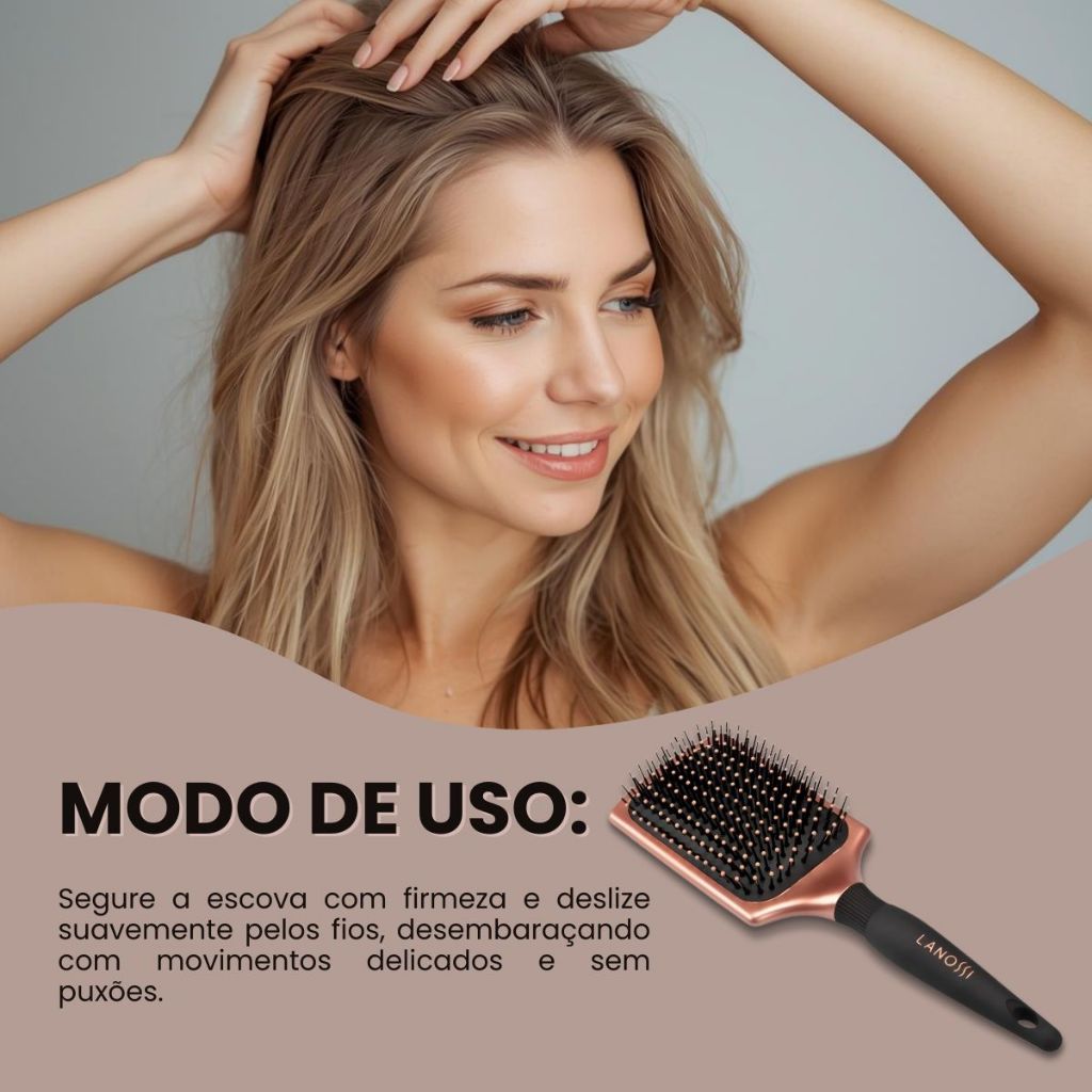 Escova Raquete Quadrada para Cabelo Bronzer Lanossi. A Escova de Cabelo Raquete Quadrada Bronzer Lanossi foi desenvolvida para quem busca desembaraçar os fios com eficiência, conforto e estilo, sem agredir o cabelo. Ideal para o uso diário, ela proporciona uma escovação suave, prática e sem puxões, mantendo os fios alinhados, macios e com mais brilho. Com a linha Bronzer Lanossi, seu cuidado diário ganha um toque de sofisticação. O acabamento em bronze metálico une design moderno e funcionalidade, deixando sua rotina de beleza ainda mais prática e elegante. Benefícios: A escova conta com almofada macia e cerdas em nylon com pontas protegidas, que deslizam facilmente entre os fios, reduzindo a quebra e o frizz. Durante o uso, proporciona uma massagem suave no couro cabeludo, auxiliando na estimulação da circulação sanguínea e promovendo cabelos com aparência mais saudável e brilhante. O cabo anatômico com textura soft touch oferece firmeza e conforto, evitando que a escova escorregue durante a escovação. Modo de Uso: Indicada para uso em cabelos secos, a escova deve ser utilizada com movimentos suaves, respeitando o sentido dos fios. Para melhores resultados: – Divida o cabelo em 3 partes (duas na frente e uma atrás); – Inicie a escovação pela nuca, subindo gradualmente até o topo da cabeça; – Desembarace sempre de baixo para cima, evitando a quebra dos fios. Por possuir almofada, não é recomendada para uso durante o banho ou com cabelos molhados, garantindo maior durabilidade do produto. Características do Produto: – Ideal para desembaraçar todos os tipos de fios secos; – Não danifica os cabelos; – Cerdas em nylon com pontas protegidas; – Almofada confortável; – Cabo anatômico com textura soft touch; – Design moderno e sofisticado; – Uso diário. Especificações: – Formato: Raquete quadrada. – Dimensões do produto: 3,8 x 8,5 x 29,2 cm. Conteúdo da Embalagem: – 1 Escova Raquete Quadrada para Cabelo Bronzer Lanossi. Imagens meramente ilustrativas. Visualizações em mobile e desktop podem sofrer alterações de cor.
