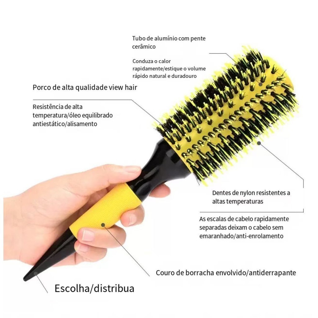 Escova De Cabelo Térmica Amarela Cerdas De Javali Mista Madeira