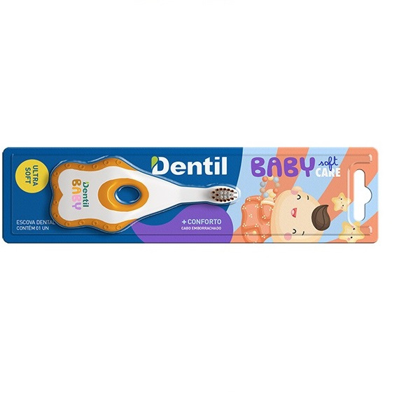 Escova de Dente Baby Soft Care Macia Cabo Emborrachado. A Escova Dentil Baby foi desenvolvida e especialmente projetada para os primeiros dentinhos. É indicada para a higiene bucal dos bebês entre 4 a 24 meses. As cerdas macias e a cabeça com borda protetora limpam e massageiam suavemente as gengivas e os primeiros dentes, proporcionando uma boa limpeza e cuidados com os dentinhos e gengiva. Lembre-se de trocar a sua escova dental a cada 3 meses Escolha o creme dental para acompanhar o seu pedido temos sem Flúor e com Flúor, confira todas as opções na nossa loja.