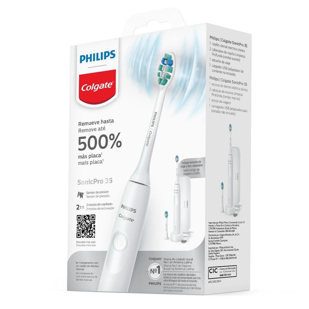 "Com a Escova de Dente Elétrica Philips Colgate Sonic Pro 35 você pode sentir a diferença de uma boa limpeza bucal. Com a escova de dente elétrica suave, que remove até 500% mais placa que uma escova manual. Essa escova de dente elétrica te dá a opção de escolha entre os dois modos de escovação e cuide de seus dentes e gengiva com o sensor de pressão, que vibra suavemente quando a escovação tiver força excessiva. Benefícios: Essa escova de dente elétrica remove até 500% mais placa (vs. escova de dentes manual). Escova de dente sônica com 2 modos de escovação: (1) Limpeza (2) Sensibilidade A escova de dente possui sensor de pressão que alerta quando você estiver escovando com muita força, protegendo dentes e gengiva. Temporizador de 2 minutos para garantir a escovação pelo tempo recomendado por dentistas."