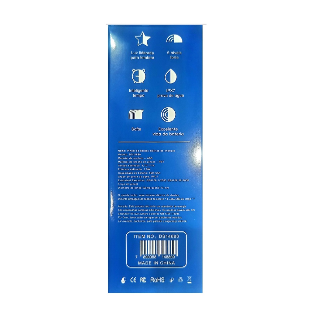 CARACTERÍSTICAS: TEMPO DE CARREGAMENTO: 3 HORAS MODOS DE VIBRAÇÃO: 4 MODOS FREQUÊNCIA DE VIBRAÇÃO: 19800 VEZES/MINuto CLASSIFICAÇÃO À PROVA D'ÁGUA: IPX7 TENSÃO NOMINAL: 1,5V POTÊNCIA NOMINAL: 1W CAPACIDADE DA BATERIA: 350MA FORMA DE ALIMENTAÇÃO: RECARREGÁVEL USB PESO: 0,1KG TAMANHO: 19,5*3,5CM MATERIAL: ABS NOME: ESCOVA DE DENTE INFANTIL ESPECIFICAÇÕES: 1. À PROVA D'ÁGUA IPX7, TODO O CORPO PODE SER LAVADO (NÃO DEVE SER IMERSO NA ÁGUA), PERMITINDO QUE AS CRIANÇAS ESCOVEM OS DENTES NO BANHO. 2. TIPO DE TURBINA DE PUNHO DE PLÁSTICO, DESIGN ÚNICO ANTIDERRAPANTE, ERGONOMIA, TORNANDO A ESCOVAÇÃO MAIS FÁCIL. 3. 4 MODOS DE ESCOVAÇÃO (MODO DE LIMPEZA/MODO DE CUIDADO/MODO SENSÍVEL/MODO DE POLIMENTO) PARA ATENDER DIFERENTES NECESSIDADES DE LIMPEZA E PROTEGER A SAÚDE BUCAL DAS CRIANÇAS. 4. FREQUÊNCIA DE VIBRAÇÃO DE 19800 VEZES POR MINUTO, 60DB BAIXO RUÍDO, LIMPEZA PODEROSA E EFICIENTE DA CAVIDADE BUCAL, REMOVENDO SUAVEMENTE A SUJEIRA NOS ESPAÇOS ENTRE OS DENTES. 5. A ESCOVA DE DENTE ELÉTRICA USA UMA CABEÇA DE ESCOVA MACIA 3D DE ALTA DENSIDADE PARA MASSAGEAR SUAVEMENTE OS DENTES E GENGIVAS, LIMPAR SUAVEMENTE A BOCA, REDUZIR DANOS AOS DENTES E PROPORCIONAR ÀS CRIANÇAS UMA EXPERIÊNCIA DE ESCOVAÇÃO CONFORTÁVEL. 6. A ESCOVA DE DENTE ELÉTRICA DE DESENHO ANIMADO ESPECIALMENTE PROJETADA PARA A LIMPEZA DOS DENTES DAS CRIANÇAS TEM UM CORPO PEQUENO E LEVE, E UMA FORMA FOFA, PERMITINDO QUE AS CRIANÇAS SEGUREM E ESCOVEM OS DENTES FACILMENTE COM UMA MÃO.