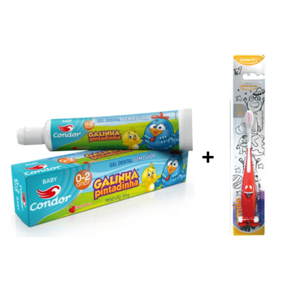 Escova Smile com ventosa extra macia Powerdent + Pasta Gel dental Galinha pintadinha Infantil sem fluor Condor Contém: -Escova Smile com ventosa extra macia >Certas extra macias; >Contém duas vertosas em sua extremidade; >Fomato divertido formando um sorriso! > +3 anos -Pasta Gel dental Infantil Galinha pintadinha sem fluor Condor: >Não contém flúor; >Ajuda a evitar a fluorose (excesso de flúor que causa manchas nos dentes); >Delicioso sabor de morango!