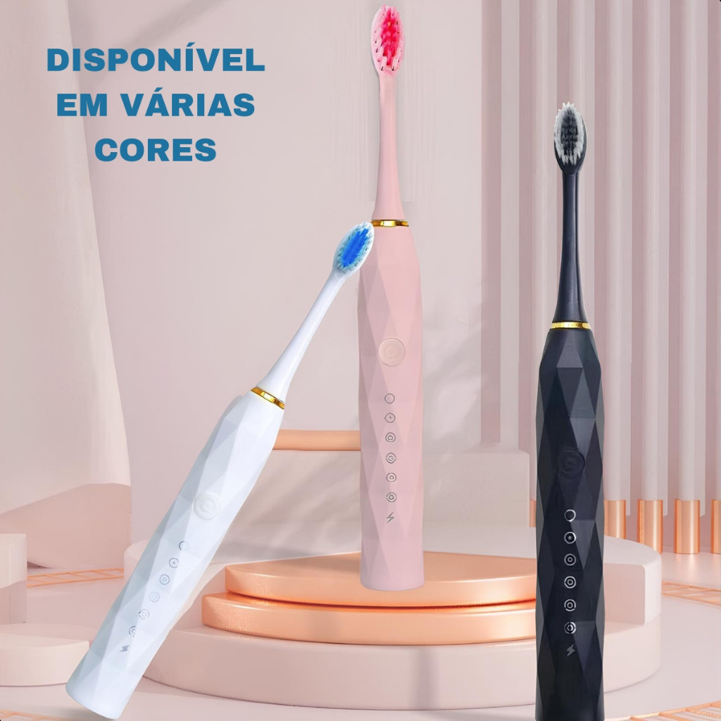 ESCOVA DENTAL ELÉTRICA SÔNICA RECARREGÁVEL – KIT COM 4 CABEÇAS Cuide da sua saúde bucal com muito mais praticidade! Escova de dente elétrica sônica, recarregável via USB, com 4 cabeças extras, ideal para uso diário e viagens. Principais benefícios: Limpeza por vibração sônica – remove mais placa do que escova manual convencional À prova d’água (IPX7) – pode ser usada no banho com segurança Bateria recarregável via USB – longa duração, ideal para levar na bolsa ou nécessaire 4 cabeças inclusas – acompanha refis para vários meses de uso Múltiplos modos de escovação – limpeza, sensível, polimento e massagem gengival Timer inteligente de 2 minutos – ajuda a cumprir o tempo ideal de escovação Design ergonômico – cabo leve, moderno e confortável de segurar Conteúdo da embalagem: 1x Escova dental elétrica sônica recarregável 4x Cabeças de escova substituíveis 1x Cabo USB para carregamento 1x Manual de instruções Especificações técnicas : Alimentação: bateria interna recarregável via USB Modos de escovação: múltiplos (limpeza, sensível, etc.) Tempo de carga: cerca de 3h Autonomia: vários dias de uso com 2 escovações ao dia Indicação: adultos e adolescentes