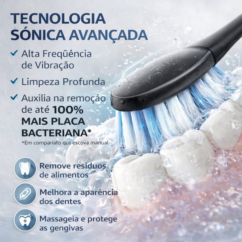 Transforme Seu Sorriso com Tecnologia Sônica de Ponta Você sabia que escovas manuais deixam de remover até 50% da placa bacteriana? Eleve sua higiene bucal a um nível profissional com a nossa Escova Elétrica Sônica Recarregável. Projetada para quem exige qualidade, estilo e eficiência, ela oferece uma limpeza profunda, removendo manchas superficiais e garantindo gengivas mais saudáveis em apenas 2 semanas de uso. O design elegante em preto fosco com detalhes dourados não é apenas bonito; é ergonômico e totalmente à prova d'água, permitindo que você a utilize durante o banho sem preocupações. PRINCIPAIS BENEFÍCIOS: -Tecnologia Sônica Avançada: Alta frequência de vibração que quebra a placa bacteriana e o tártaro com facilidade, alcançando lugares que escovas comuns não alcançam. - 5 Modos de Limpeza Personalizados: Limpeza (Clean): Para uso diário e remoção eficiente de placa. Polimento (Polish): Para dar brilho e remover manchas de café/chá. Suave (Mild/Sensitive): Ideal para iniciantes ou dentes sensíveis. Branco (White): Foco na remoção de manchas para clareamento. Cuidado Gengival (Gum Care): Massagem suave para estimular a circulação. - Timer Inteligente: Pausas breves a cada 30 segundos para lembrar você de mudar a área da boca, desligando automaticamente após 2 minutos (tempo recomendado pelos dentistas). - Bateria de Longa Duração: Carregamento via USB prático. Uma carga completa pode durar semanas (ideal para viagens). - Kit Completo: Chega de gastar dinheiro todo mês. O kit acompanha 4 cabeças de reposição extras, garantindo mais de 1 ano de uso sem custos adicionais. ESPECIFICAÇÕES TÉCNICAS: Tipo: Escova Elétrica Sônica / Ultrassônica Cor: Preto Premium (Black Piano/Matte) Alimentação: Recarregável via cabo USB (incluso) Classificação à prova d'água: IPX7 (Lavável e resistente para uso no banho) Cerdas: Macias e arredondadas para não machucar a gengiva (Material Premium) Indicador de Carga: Luz LED que avisa quando carregar O QUE VEM NA CAIXA: 1x Corpo da Escova Elétrica 4x Refis (Cabeças) de Escova 1x Cabo de Carregamento USB PERGUNTAS FREQUENTES (FAQ): A escova é bivolt? Sim! Como o carregamento é via USB, ela pode ser carregada em qualquer adaptador de celular (110v ou 220v), computador ou powerbank. Serve para quem usa aparelho ortodôntico? Com certeza. A vibração sônica ajuda a limpar os bráquetes com muito mais eficiência que a escovação manual. As cerdas são duras? Não, as cerdas possuem dureza média/macia, ideal para limpar sem agredir o esmalte.