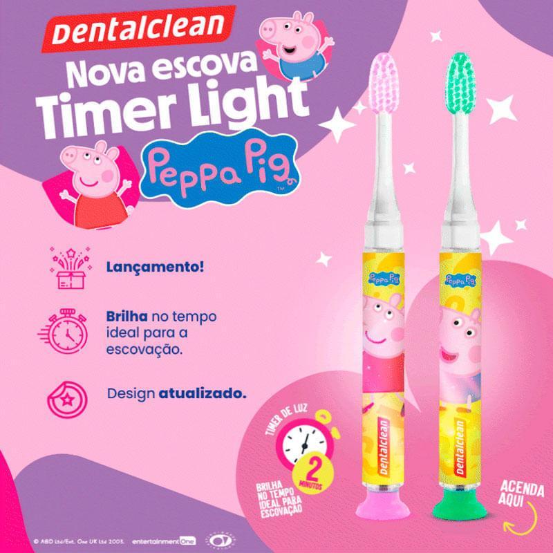 Escova Peppa Pig Timer Light Macia Dentalclean: Timer de Luz A Escova de Dentes Dentalclean Peppa Pig Timer Light Macia é uma escova infantil criada especialmente para tornar o momento da escovação mais divertido e educativo para as crianças. Inspirada no personagem George do desenho Peppa Pig, ela possui um sistema de luz com timer que pisca por 1 minuto, indicando o tempo ideal para escovar cada arcada dentária (superior e inferior), incentivando a escovação correta. Desenvolvida com cerdas extra macias, é ideal para crianças a partir de 3 anos, ajudando a proteger gengivas sensíveis e dentes em desenvolvimento, pensada para que as crianças aprendam desde cedo a importância da higiene bucal, de forma leve e divertida. Diferenciais: - Luz com timer de 1 minuto: ensina o tempo certo de escovação - Design da Peppa Pig: atrai a atenção e incentiva o hábito - Cerdas extra macias: protege os dentes e gengivas das crianças - Cabo anatômico: fácil de segurar por mãos pequenas - Indicação a partir dos 3 anos: segura e eficaz para os pequenos Como utilizar a Escova de Dentes Dentalclean Peppa Pig Timer Light Macia? - Aplique uma pequena quantidade de creme dental infantil nas cerdas. - Pressione o botão para ativar a luz com cronômetro. - Ensine a criança a escovar os dentes até a luz apagar (cerca de 1 minuto por arcada). - Após o uso, lave a escova com água corrente e deixe secar naturalmente. - Substitua a escova a cada 3 meses ou quando as cerdas estiverem desgastadas. Dica para os Pais: - Supervisione a escovação até que a criança desenvolva coordenação e autonomia suficientes. - Use creme dental infantil com flúor na quantidade recomendada. Perguntas Frequentes: 1. A partir de que idade meu filho pode usar essa escova? A escova é indicada para crianças a partir de 3 anos. 2. A luz da escova é recarregável? Não. A luz é alimentada por bateria interna, que dura conforme o uso. Quando parar de funcionar, substitua a escova. 3. A escova é à prova d’água? Sim, foi desenvolvida para o uso diário e contato com água, mas não deve ser submersa. A Escova de Dentes Dentalclean Peppa Pig Timer Light Macia é a escolha ideal para transformar a escovação em um momento divertido, educativo e seguro para as crianças. Com luz temporizadora e cerdas suaves, ela ajuda a desenvolver bons hábitos desde cedo.