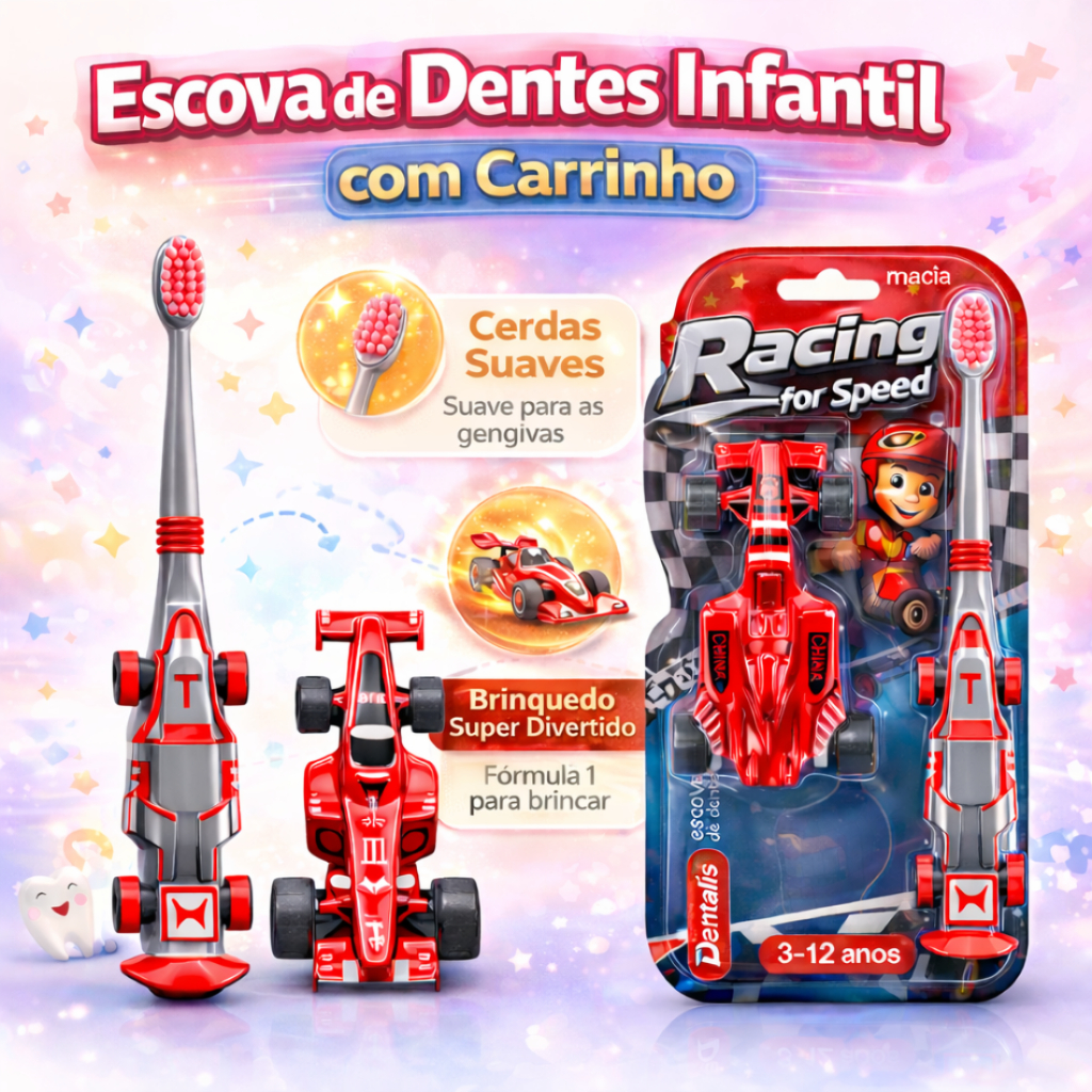 | Escova Dental Infantil Menino com Brinquedo Carrinho Fórmula 1, Cer... este produto | R$ 14,80 | 45% | 4.9/5 | — |