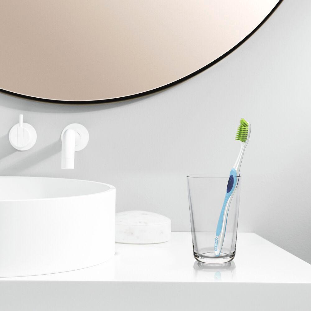 A escova Oral-B GENGIVA DETOX ajuda a remover bactérias que geram a placa bacteriana. Ela une duas tecnologias de Oral-B: as cerdas Ultrafinas e cruzadas. As cerdas ULTRAFINAS com pontas de até 20x mais finas limpam profundamente a linha entre dentes e gengiva. As cerdas cruzadas têm o ângulo perfeito que maximiza o alcance e remoção da placa na área interproximal. Em comparativo com uma escova de cerdas planas com cerdas regulares. *Imagens Meramente Ilustrativas.