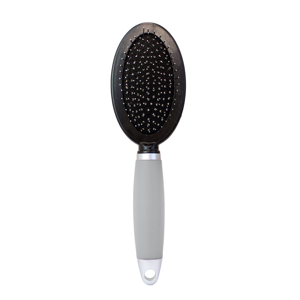 A Escova Dupla Cabo de Gel para Cães e Gatos G é extremamente confortável e perfeita para finalizar o look do seu pet, além de deixá-lo com uma ótima aparência. Com dois lados diferentes, um lado com pinos de metal que contribuem para pentear retirando até as sujeiras mais difíceis que insistem em ficar presas ao pelo e também para dar o toque final. Do outro lado, as cerdas macias que ajudam a retirar a sujeira do dia-a-dia ou para dar o brilho final naquele pelo lindo. O cabo em gel siliconado, promove máximo controle e extremo conforto para trabalhar. Mantem a mão em uma posição natural, que evita a fadiga e previne lesões por movimentos repetitivos, e se molda a curvatura dos dedos para uma pegada muito mais natural.