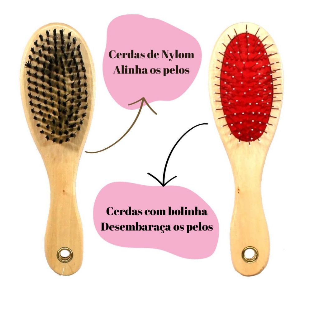 Escova Dupla Cabo de Madeira para Pelos Pet Penteia Desembaraça Tira Nós Cerdas Nylon Cachorro Gato