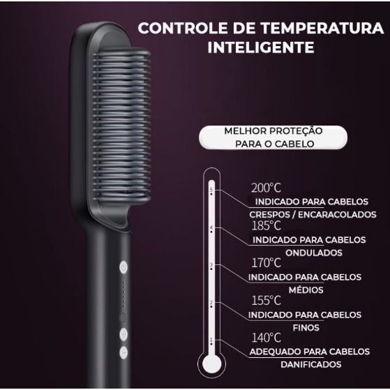 - Cabo giratório 360° - Caixa e manual em português - Mantém temperatura constante em 200° ( a antiga cai a temperatura conforme vai usando ). - Esquenta mais rápido A Escova alisadora de cabelos, foi especialmente desenvolvida para FACILITAR totalmente a sua vida, graças a sua tecnologia de alisar cada mecha do cabelo de maneira individual e ao mesmo tempo, sem causar danos aos fios, poupando seu tempo para que você possa aproveitar ainda mais o seu dia estando sempre arrumada, com os cabelos lisos e alinhados de forma rápida e prática, em menos de 20 minutos. A mesma, possui uma Tecnologia Exclusiva de Multiplacas, que durante o uso da escova, cada mecha é dividida em 25 partes através de placas de cerâmica PTC com iôns, onde são alisadas, modeladas e alinhadas desde a raiz até as pontas de maneira individual. Esse processo evita que você passe a escova na mecha mais de uma vez, garantindo cabelos lisos e alinhados com apenas uma passada! A Escova alisadora conta com um sistema de temperatura inteligente. Contém um regulador de temperatura de 5 níveis adequados para cada tipo de cabelo: 200°C - adequado para cabelos resistentes (grossos ou crespos) 185°C - adequado para cabelos ondulados e levemente cacheados 170°C - adequado para cabelos escuros ou com tintura 155°C - adequado para cabelos descoloridos, com química ou fragilizados 140°C - adequado para cabelos danificados, finos ou fragilizados É totalmente recomendada para todos os tipos de cabelo, porém para alcançar o resultado de um cabelo sedoso e saudável, antes da aplicação, certifique o grau mais adequado de acordo com o seu tipo de cabelo, para evitar problemas no efeito liso, danos e ressecamento! MODO DE USAR: Ao pressionar o botão de liga/desliga você deve pressionar os botões de aumentar +/Reduzir - , até selecionar a temperatura desejada. Quando o aparelho estiver aquecendo para atingir a temperatura selecionada, as luzes do Indicador de Temperatura ficarão piscando. Assim que a temperatura for atingida, as luzes ficarão fixas e acesas, indicando que o aparelho está pronto para ser usado. 1. Com os cabelos limpos e secos, utilize um pente ou escova para desembaraçar cada mecha. 2. Conecte o aparelho à tomada e aperte o Botão Power. 3. Ajuste a temperatura usando os botões de Aumentar +/Reduzir -. Para cabelos crespos ou grossos, sugerimos a Temperatura 5 (200ºC). 4. Divida o cabelo em sessões e trabalhe com uma mecha por vez. Para cabelos crespos ou grossos, sugerimos trabalhar com mechas menores e mais finas. 5. Segure firmemente a mecha pelas pontas e puxe-a levemente para fora do rosto, de modo com que os fios fiquem firmes e esticados. 6. Continue segurando a mecha firmemente pelas pontas. Encaixe a Escova alisadora na mecha e deslize-a lentamente em um movimento continuo para baixo. Quanto mais lentamente você deslizar a escova, mais lisos seus fios ficarão. Os fios devem adentrar completamente a escova para ficarem em contato com as mini-placas de cerâmica presente no interior das cerdas. 7. Após o uso, desconecte o aparelho da tomada imediatamente e aguarde até que ele esfrie completamente para depois guarda-lo. CARACTERÍSTICAS DO PRODUTO: - Marca: Straight Comb - Modelo: Escova Alisadora De Cabelos - Cores enviadas aleatoriamente conforme disponibilidade em estoque. - Dimensões do produto: 27 x 3 cm - Peso: 386g ESPECIFICAÇÕES TÉCNICAS: - Potência: 45W - Frequência nominal: 50Hz - Voltagem: 110V/220V - Bivolt automático - Material das placas: Cerâmica PTC - Temperatura: 5 níveis ( 140°C a 200°C) CONTEÚDO DA EMBALAGEM: - 1 Escova Pente Alisadora de Cabelo - 1 Manual