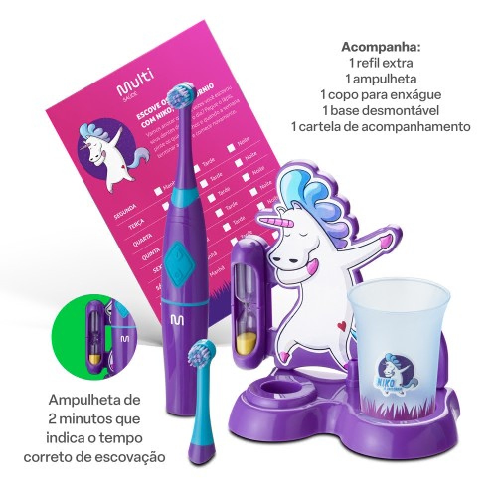 Escova Infantil Elétrica Rotacional Multi Saúde Funny Brush Niko - HC054 A higiene bucal pode ser mais divertida A escova elétrica infantil Funny Brush proporciona para a criança uma escovação mais divertida. Através de elementos sensoriais da escova, ocorre a aproximação da criança com a higiene bucal. - Cerdas macias que não machucam a boca da criança - Escova rotacional que facilita a escovação - Com timer que indica o tempo correto de escovação - Remove 2x mais as placas bacterianas. - Funciona com 2 pilhas AAA Higiene bucal mais eficiente e divertida Através de elementos sensoriais como o movimento rotacional das cerdas, ilustrações e cores do produto, ocorre a aproximação da criança com o momento da higiene bucal antes visto como entediante. Praticidade e economia Com 4 mil movimentos por minuto, a Funny Brush é muito mais eficaz que uma escova dental convencional, pois além de auxiliar a escovação da criança, ela garante também economia pois a cada 3 meses a única coisa que precisa ser trocada é o *refil. E não se preocupe! A Funny Brush é resistente à água, então seus pequenos podem molhar a escova sem preocupações. E ela também acompanha uma cartela de escovação para que a saúde bucal fique sempre em dia. *Você pode adquirir o Refil de reposição do mesmo personagem quando necessário a troca! Compatível com o Refil HC274 (vendido separadamente) para reposição. Ficha Técnica Marca: Multi Saúde Modelo: Escova Infantil Elétrica Rotacional Multi Saúde Funny Brush Niko - HC054 Resistente à Água: Sim Cor: Roxo Idade: +3 anos Pilhas: 2 Pilhas AAA Dimensões do produto (LxAxC): 3 x 2,7 x 21 cm Peso do produto: 300g Conteúdo da Embalagem: 1 Escova Elétrica, 1 Refil Extra, 1 Ampulheta, 1 Copo para Enxágue, 1 Base Desmontável de Apoio, 1 Cartela de Acompanhamento, 1 Manual de Instruções. Garantia: 1 Ano *Imagens meramente ilustrativas.