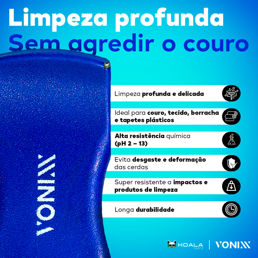 Escova de Limpeza Cerdas Macias – Vonixx LIMPEZA PROFUNDA, SEM AGREDIR O COURO OU O TECIDO A Escova Vonixx de Cerdas Macias garante uma limpeza profunda e segura em bancos de couro, tecidos e até tapetes de borracha — sem riscar ou danificar a superfície. Suas cerdas em PBT de alta resistência química e mecânica proporcionam durabilidade, flexibilidade e performance superior. - Limpeza profunda e delicada - Alta resistência química (pH 2 – 13) - Ideal para couro, tecido, borracha e tapetes plásticos - Evita desgaste e deformação das cerdas - Super resistente a impactos e produtos de limpeza - Longa durabilidade TECNOLOGIA PBT Cerdas com baixa deformação, alta resistência mecânica e química — eficiência constante, mesmo com uso intenso. Ficha Técnica: Material: Cerdas em PBT + base plástica Medidas: 15 cm (comprimento) | 2,5 cm (altura das cerdas) pH de resistência: 2 a 13 Indicação: limpeza de bancos, tecidos, couros, tapetes e borrachas Enviamos bem embalado, super rápido e com garantia de originalidade. Garanta o seu e confira os outros produtos da nossa Loja Koala Parts. Conteúdo da Embalagem: 01 Escova de Limpeza Cerdas Macias Vonixx
