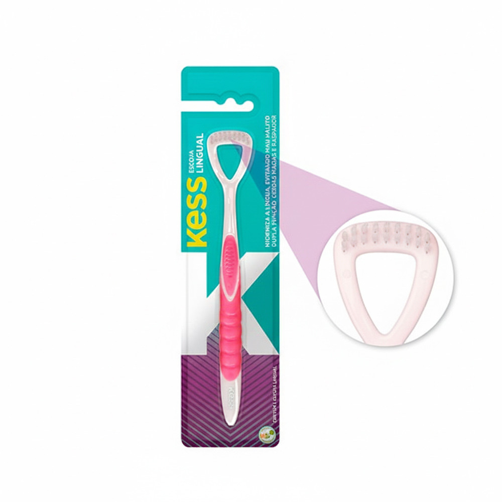 Escova para Higienização Lingual Kess A Escova para Higienização Lingual Kess é um item essencial para uma higiene bucal completa, auxiliando no combate ao mau hálito (halitose). Seu design funcional oferece dupla ação: cerdas de nylon macias que limpam delicadamente a superfície da língua e um raspador que ajuda a remover e eliminar resíduos acumulados. É especialmente eficaz na remoção da saburra lingual — camada esbranquiçada formada principalmente por bactérias e restos de alimentos, uma das principais causas do mau hálito. Disponível nas cores rosa ou azul (enviadas conforme disponibilidade). Benefícios • Auxilia no combate ao mau hálito • Remove resíduos e bactérias da língua • Cerdas macias para limpeza suave • Raspador eficiente para a remoção da saburra lingual • Prática e fácil de usar Modo de Uso Inicie a higienização utilizando as cerdas, escovando suavemente a língua para remover os resíduos acumulados. Em seguida, utilize o raspador, deslizando-o delicadamente da base para a ponta da língua. Enxágue bem após o uso. Ideal para complementar a rotina diária de higiene bucal, proporcionando sensação de limpeza e frescor prolongados.