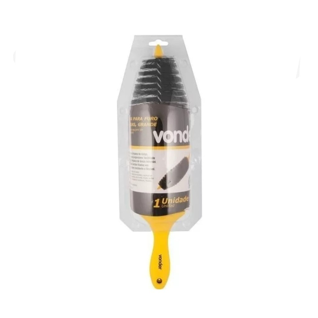 Escova para furo de rodas, Grande, VONDER Anúncio contém : Escova para furo de rodas, grande, VONDER Indicada para limpeza de rodas. Cuidado! As cerdas podem reter resíduos que riscam a superfície. Tenha cuidado na aplicação. Tem formato que proporciona facilidade e agilidade na limpeza de áreas internas da roda. Possui cerdas fixadas em estrutura de arame resistente e flexível. Sobre a vonder: A VONDER é uma das marcas mais completas do Brasil em sua categoria, sendo detentora do melhor e mais completo mix de ferragens, ferramentas, máquinas e equipamentos para uso profissional do mercado.