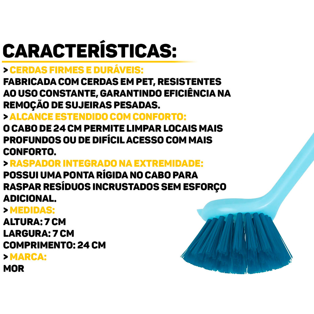 Escova Redonda Multiuso Mor A Escova Redonda Multiuso da Mor foi desenvolvida especialmente para alcançar cantos estreitos e áreas de difícil acesso, garantindo uma higienização completa. Seu design ergonômico proporciona conforto durante o uso, enquanto as cerdas resistentes removem até a sujeira mais difícil sem danificar as superfícies. Ideal para banheiros, cozinhas, rejuntes, cantos de pisos e muito mais, essa escova é prática, durável e indispensável no seu dia a dia. Características: > Cabo ergonômico para maior conforto; > Formato redondo ideal para cantos estreitos; > É versátil e possui uma extremidade útil para a raspagem de sujeiras; > Cerdas firmes e resistentes para uma limpeza mais completa e eficaz. Especificações Técnicas: > Material: polipropileno; > Dimensões do produto (C x L x A): 24cm x 7cm x 7cm. - Marca: Mor - Garantia: 90 dias contra defeitos de fabricação Vantagens de comprar na Brester: - Produto a pronta entrega. - Produto novo, com garantia de fábrica. - Nota fiscal para Pessoa Física e Pessoa Jurídica.