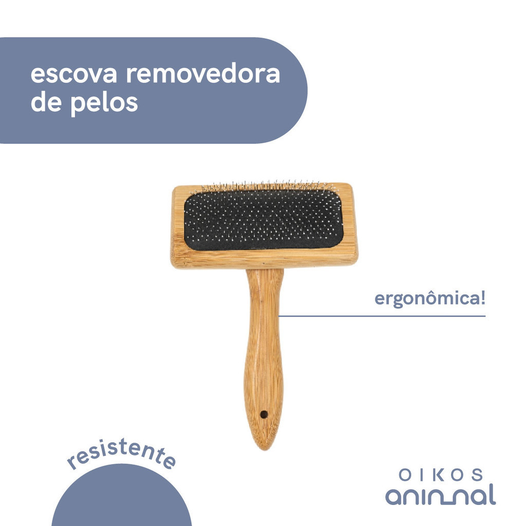 "conheça a escova removedora de pelos da oikos animal! prática e moderna, penteia e desembaraça sem dificuldade, evitando nós e pelos soltos pela casa! possui cerdas especiais para todos os tipos de pelos e pega ergonômica que ajuda na hora de pentear. além disso, estimula a circulação sanguínea e ajuda no crescimento de pelos mais saudáveis! é de bambu: resistente e durável. mantenha seca e, ao lavar, seque bem e deixe em local arejado. leve qualidade e praticidade para sua rotina com o pet! medidas: altura: 10,5 cm largura: 16 cm"