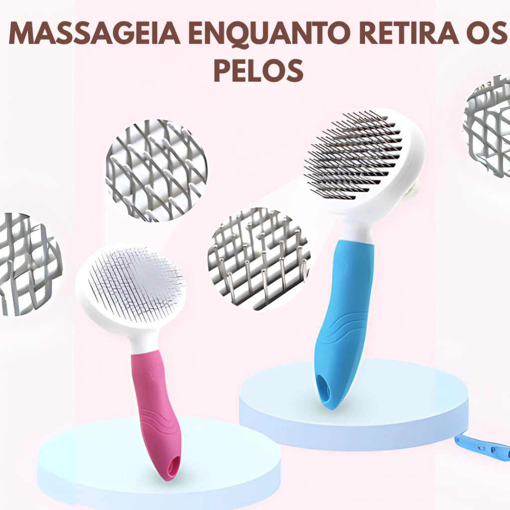 Características principais: Design Ergonômico e Confortável: A escova possui um cabo anatômico que proporciona uma pegada confortável, garantindo um manuseio seguro e sem esforço. Ideal para sessões de escovação prolongadas. Cerdas de Alta Qualidade: As cerdas de aço inoxidável são finas, flexíveis e eficazes na remoção de pelos soltos e nós, sem causar desconforto ou dor ao seu pet. Elas penetram profundamente no pelo sem agredir a pele, eliminando até mesmo os pelos mais difíceis de alcançar. Fácil de Usar: Com um sistema de botão que permite a remoção dos pelos acumulados nas cerdas, a escova se torna prática de limpar, mantendo o processo de escovação muito mais ágil e higiênico. Ideal para Pelos Longos ou Curtos: Funciona bem para diferentes tipos de pelagem, seja para cães e gatos de pelo curto, médio ou longo. É especialmente eficaz para raças que tendem a soltar muitos pelos ou têm pelos mais espessos e difíceis de escovar. Previne a Formação de Nós: A escova ajuda a prevenir o surgimento de nós e emaranhados no pelo, promovendo uma pelagem mais saudável e brilhante. Também pode ser usada para massagear a pele do animal, estimulando a circulação sanguínea e promovendo o bem-estar do pet. Conforto para o Pet: A escova foi projetada para proporcionar uma sensação de relaxamento durante o uso, sendo ideal para pets que se sentem incomodados com a escovação convencional. Seu design cuidadoso assegura que os pelos sejam removidos sem causar danos ou irritação na pele do animal.