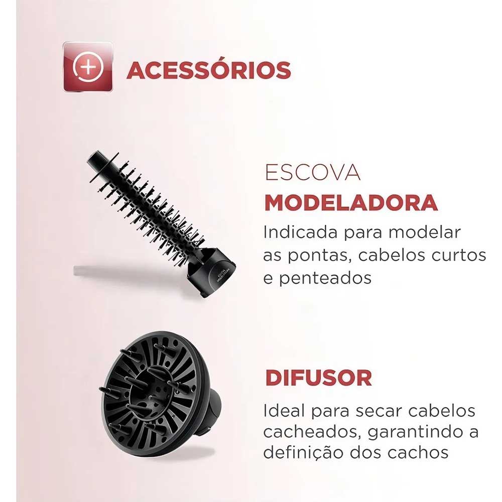 Transforme sua rotina de beleza com a Escova Rotativa Mondial Black Rose ER-10. Um único aparelho que reúne praticidade, desempenho e cuidado com os fios. Seu sistema 5 em 1 permite secar, alisar, modelar, definir cachos e finalizar franjas e pontas, entregando resultados profissionais no conforto da sua casa. O acabamento dos fios fica visivelmente mais bonito e saudável graças ao revestimento cerâmico com tecnologia Tourmaline Íon, que ajuda a reduzir o frizz, aumentar o brilho e manter a maciez do cabelo. Principais Diferenciais: Sistema rotativo motorizado Combina o movimento da escovação com o calor do secador, facilitando a modelagem. Possui rotação dupla 360°, permitindo criar ondas para dentro ou para fora com muito mais controle. Função 5 em 1 Seca, alisa, modela, define cachos e finaliza os detalhes do penteado com apenas uma mão, eliminando a necessidade de usar escova e secador separadamente. Cuidado avançado com os fios O revestimento em cerâmica distribui o calor de forma uniforme e protege os cabelos. Já a Tourmaline Íon libera íons que selam as cutículas, combatendo a eletricidade estática e proporcionando cabelos mais sedosos, brilhantes e sem frizz. Conjunto completo de acessórios Acompanha 4 acessórios que ampliam as possibilidades de uso: Escova rotativa para alisar e modelar; Bocal direcionador para secagem rápida e precisa; Escova modeladora para penteados elaborados e definição das pontas; Difusor ideal para cabelos cacheados, ondulados ou crespos, promovendo definição e controle do frizz. Alto desempenho Com 1.200W de potência, garante secagem eficiente e resultados rápidos. 3 níveis de temperatura Permite ajustar o calor conforme o tipo de cabelo e o efeito desejado. Cabo giratório 360° Proporciona mais conforto e liberdade de movimento, evitando que o fio enrole durante o uso. *Imagens Meramente Ilustrativas. *As cores do produto podem variar de acordo com o monitor, a iluminação do ambiente e a sua percepção visual. *Verifique nossas políticas internas para que não haja nenhuma dúvida no processo de entrega ao finalizar a compra.