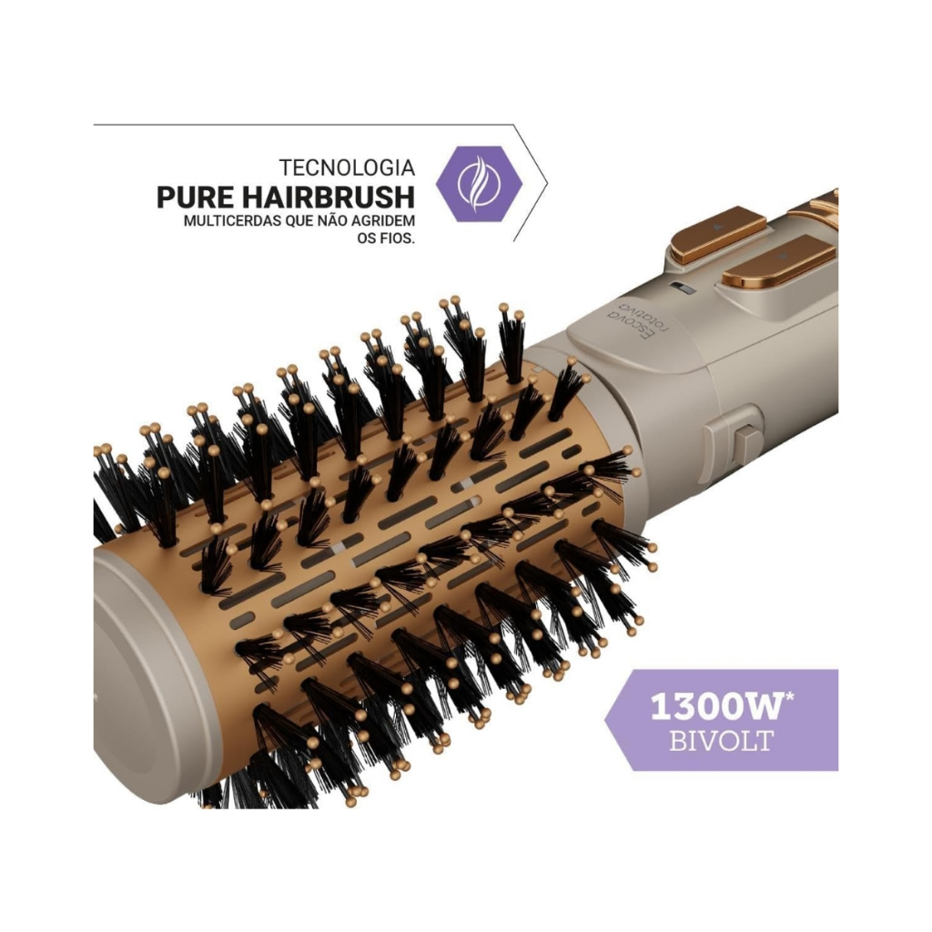 Escova Rotativa Philco 5 em 1 Bivolt 1300W PER03 --- Descrição --- A Escova Rotativa Philco PER03 é um verdadeiro 5 em 1 que transforma a sua rotina capilar. Com 1300W de potência e tecnologia Íon Tourmaline, ela seca, alisa, modela, define cachos e finaliza com facilidade, garantindo cabelos mais brilhantes e sem frizz. Conta com rotação em dois sentidos, cerdas ultramacias e revestimento cerâmico que protege os fios do calor excessivo. Leve, prática e bivolt, é perfeita para ser usada em casa ou levada em viagens. --- Características --- • 5 em 1: Seca, alisa, modela, define cachos e finaliza em um único produto; • Cerdas ultramacias: Tecnologia Hairbrush com nylon que desliza sem agredir os fios; • Potência de 1300W, Bivolt; • Íons Tourmaline: Reduz frizz e mantém a umidade natural dos fios; • Dupla rotação: Gira nos dois sentidos (horário e anti-horário) para facilitar a modelagem. Possui cabo 1,80m giratório. --- Características Adicionais --- • Pente com pontas alisadoras revestidas em cerâmica; • Escova modeladora; • Escova rotativa com revestimento cerâmico; • Bico Difusor. --- Dimensões do Produto --- Altura: 8,5 cm; Largura: 41,5 cm; Comprimento: 8 cm; Peso: 0,78. --- Composição da Embalagem --- • 1 Pente com pontas alisadoras revestidas em cerâmica; • 1 Escova modeladora; • 1 Escova rotativa com revestimento cerâmico; • 1 Bico Difusor. — Perguntas Frequentes — O produto é original? Sim, pirataria é crime e deve ser denunciado à Shopee. Acompanha Nota Fiscal? Sim. O produto tem a garantia legal do fabricante? Sim. Consulte o campo garantia do anúncio. Estoque limitado – Garanta já o seu! Compre agora e aproveite nossas promoções especiais!