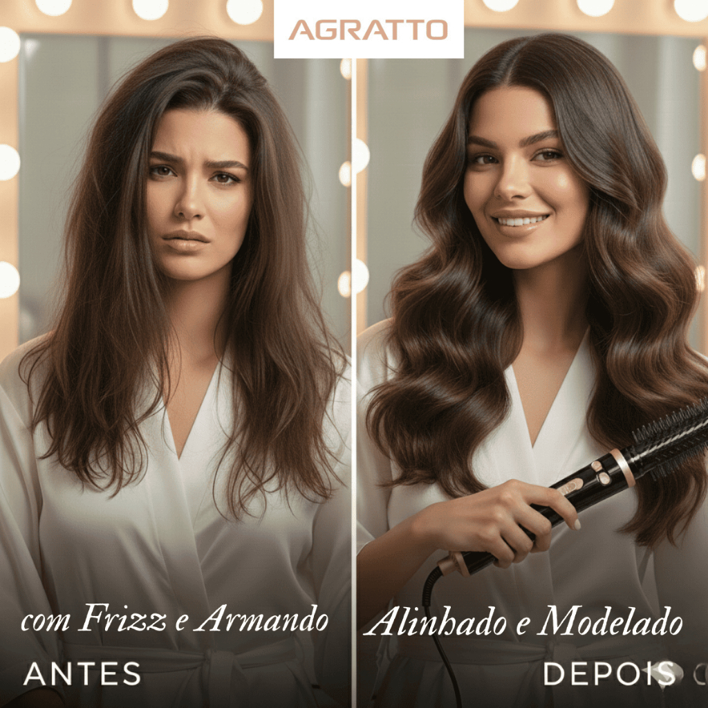 Transforme sua rotina de cuidados com o cabelo com a Escova de Cabelo Rotativa Agratto Della ECR 01. Um único aparelho capaz de secar, alisar, modelar, dar brilho e volume, com praticidade, segurança e tecnologia profissional. Equipada com placas cerâmicas antiaderentes, ela distribui o calor de forma uniforme, reduzindo danos aos fios e garantindo um acabamento muito mais saudável. A tecnologia Tourmaline Íon neutraliza a eletricidade estática, combatendo o frizz e deixando os cabelos mais macios, alinhados e com brilho intenso. Possui dois sentidos de rotação (direita e esquerda), facilitando a modelagem e permitindo criar ondas, volume ou um liso natural com muito mais controle. São 2 níveis de temperatura e 2 velocidades de giro, adaptando-se perfeitamente a cabelos lisos, ondulados, volumosos, finos ou grossos, secos, úmidos ou molhados. O bivolt seletivo (127V / 220V) torna o produto ideal para levar em viagens, enquanto o cabo giratório 360° com aproximadamente 185 cm garante liberdade total de movimentos durante o uso. Seu design ergonômico e leve (cerca de 510g) proporciona conforto mesmo em usos prolongados. Além disso, a escova é desacoplável, facilitando a limpeza, o armazenamento e aumentando a durabilidade do produto. ✨ Mais praticidade, mais beleza e resultado de salão em casa. Garanta já a sua! ⚙️ FICHA TÉCNICA COMPLETA Marca: Agratto Linha: Della Modelo: ECR 01 Tipo: Escova Rotativa Secadora Potência: 1100W (127V) / 1200W (220V) Voltagem: Bivolt seletivo Frequência: 60Hz Tecnologia: Tourmaline Íon Revestimento: Cerâmica antiaderente Níveis de temperatura: 2 Velocidades de giro: 2 Sentidos de rotação: Direita e esquerda Tipo de cerdas: Mistas com pontas macias resistentes ao calor Cabo: Giratório 360° Comprimento do cabo: ~185 cm Escova removível: Sim Peso aproximado: 510 g Cor: Preto com detalhes rosé Uso: Doméstico Garantia: 12 meses (fabricante) Produto importado ⭐ 5 PRINCIPAIS DIFERENCIAIS Tecnologia Tourmaline Íon – Reduz frizz e eletricidade estática Giro duplo automático – Modela com mais facilidade e rapidez Placas cerâmicas – Protegem os fios e distribuem melhor o calor Bivolt seletivo – Ideal para viagens e qualquer ambiente Escova desacoplável – Mais higiene, praticidade e durabilidade 💎 5 QUALIDADES Produto multifuncional (seca, alisa e modela) Acabamento profissional em casa Fácil de usar, mesmo para iniciantes Leve, ergonômica e confortável Marca reconhecida no mercado brasileiro ❓ PERGUNTAS FREQUENTES (FAQ) ✔ Posso usar com o cabelo molhado? Sim, pode ser usada em cabelos secos, úmidos ou molhados. ✔ A escova gira para os dois lados? Sim, possui rotação para direita e esquerda. ✔ É bivolt automático? Não. É bivolt seletivo, é necessário ajustar a chave antes do uso. ✔ Serve para cabelo curto? Sim, funciona em cabelos curtos, médios e longos. ✔ Possui garantia? Sim, garantia de 12 meses pelo fabricante. escova rotativa, escova secadora, escova giratoria, escova rotativa agratto, escova della, escova ecr 01, escova bivolt, escova ceramica, escova ionica, escova tourmaline, escova alisadora, escova modeladora, escova cabelo giratoria, escova para cabelo, escova profissional, escova salon line, escova rotativa bivoute, escova secadora bivolt, escova rotativa 1100w, escova rotativa 1200w, escova giratória, escova giratoria bivolt, escova alisadora giratoria, escova de cabelo eletrica, escova de cabelo rotativa, escova pra cabelo, escova cabelo lisa, escova cabelo ondulado, escova cabelo volumoso, escova frizz, escova anti frizz, escova cerâmica, escova ion, escova rotativa preta, escova rosa, escova agrato, escova agratto della, escova giratoria agratto, escova secadora agratto, escova cabelo salon