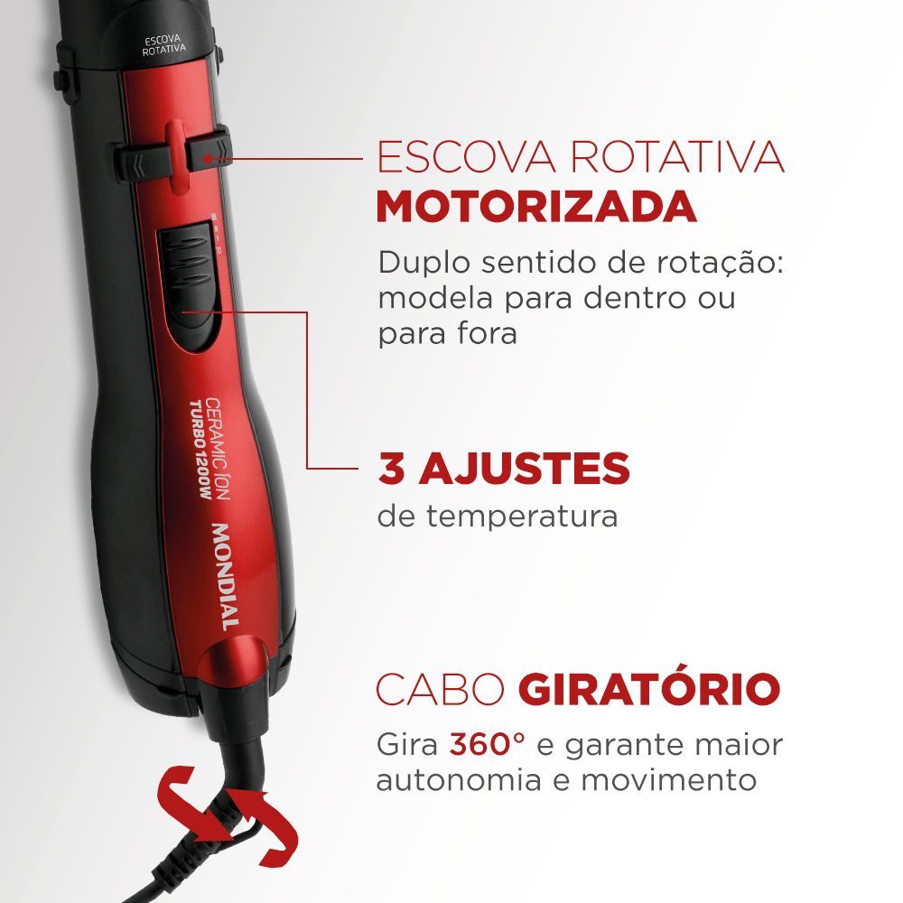 Escova Rotativa Mondial ER09 Ceramic Íon Turbo 5x1 1200W Vermelha