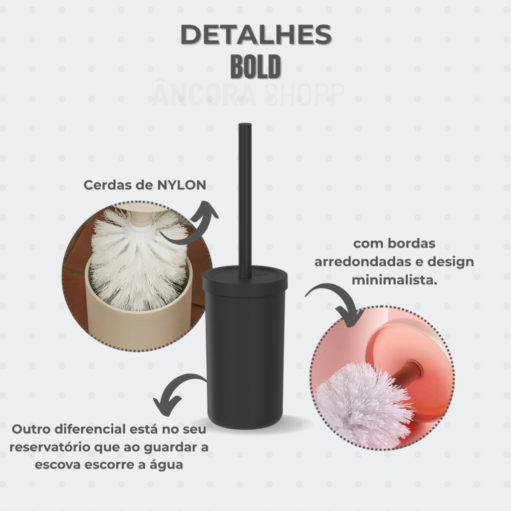 A escova sanitária Bold combina estilo e funcionalidade. Ela foi pensada e desenvolvida para uma limpeza eficiente e também para manter o seu banheiro sempre higiênico e agradável. Fabricada em material resistente PP + NYLON, com bordas arredondadas e design minimalista, ela ainda deixa o seu banheiro mais bonito. Praticidade, beleza e elegância Seu banheiro mais sofisticado. Deixe seu ambiente mais sofisticado e higienizado Cores que combinam com o seu ambiente. Qualidade e organização Para um ambiente mais tranquilo. Cores que combinam com o seu ambiente Para deixa-lo ainda mais lindo e higienizado. Características do Produto: Medidas: Profundidade: 9,8cm Largura: 9,8cm Altura: 34,5cm Especificações: Matéria- prima: Polipropileno