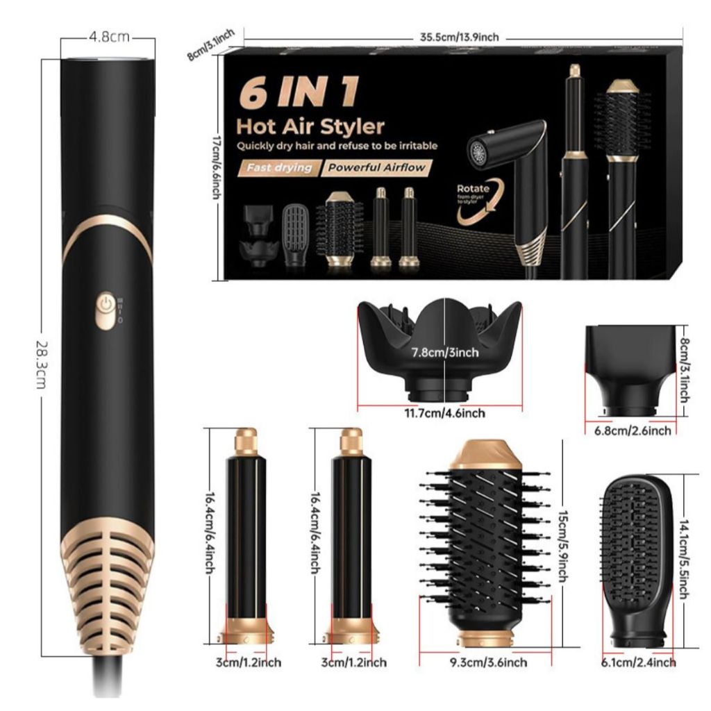Escova Secadora Dobrável 6 em 1 – Modela, Alisa e Cacheia Transforme sua rotina de cuidados com os cabelos com esta escova secadora multifuncional. Um único aparelho que seca, alisa, modela e dá volume, trazendo praticidade e resultado de salão em casa. 🔹 Benefícios: • Função 6 em 1: seca, alisa, modela cachos, cria volume e reduz o frizz. • Design dobrável: fácil de transportar e guardar. • Tecnologia de ar quente: protege os fios enquanto modela. • Acessórios intercambiáveis para diferentes estilos: • Barril de 30mm para cachos • Pente cilíndrico para volume • Pente liso para cabelos alinhados • Difusor para ondas naturais • Bico concentrador para secagem rápida 📋 Especificações Técnicas: • Potência: 600W • Tensão: 110–220V • Material: ABS + Nylon • Comprimento do cabo: 1,8m • Velocidade de rotação: 35.000 rpm