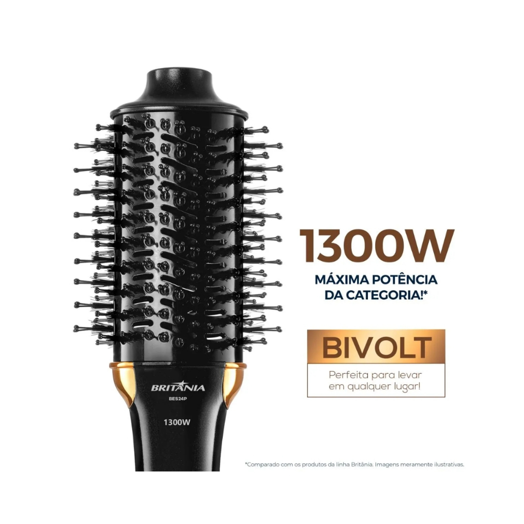 Escova Secadora BES24P Compact Preto 1300w Bivolt Britânia PRODUTO BIVOLT MANUAL! --- Descrição --- - Compacta e perfeita para você deixar seus cabelos perfeitos onde for! - A Escova Secadora Britânia BES24P 1300W conta com o poder dos Íon Negativos que eliminam a estática gerando maciez e eliminando o frizz, mantendo a umidade natural dos fios. - A tecnologia Infrared da Escova Secadora é a emissão de luz infravermelha que ajuda a restaurar os danos causados aos fios, hidrata o cabelo evitando o ressecamento excessivo, é antifrizz e sela as cutículas capilares. - Assim os cabelos crescem mais rápido e mais saudáveis! - São 1300W de potência garantindo alta performance em 3 temperaturas que você pode combinar com 2 velocidades para deixar o penteado da melhor forma. - Perfeita para todos os tipos de cabelos. - O revestimento em cerâmica da Escova Secadora Britânia BES24P permite um maior alcance de altas temperaturas de forma mais rápida! - E conta com uma eficiente abertura de ventilação, que resulta em uma maior abertura para a passagem de calor, proporcionando uma secagem mais rápida e eficaz. --- Características --- • 1300W de potência • Produto bivolt • 3 temperaturas • 2 velocidades • Cordão elétrico giratório • Tourmaline ion • Luz infrared • Tamanho compacto • Cordão elétrico com 1,80m. --- Dimensões do Produto --- • Altura: 7,5 cm; • Largura: 37 cm; • Comprimento: 9,5 cm; • Peso: 0,47 kg. — Perguntas Frequentes — O produto é original? Sim, pirataria é crime e deve ser denunciado à Shopee. Acompanha Nota Fiscal? Sim. O produto tem a garantia legal do fabricante? Sim. Consulte o campo garantia do anúncio. Estoque limitado – Garanta já o seu! Compre agora e aproveite nossas promoções especiais!