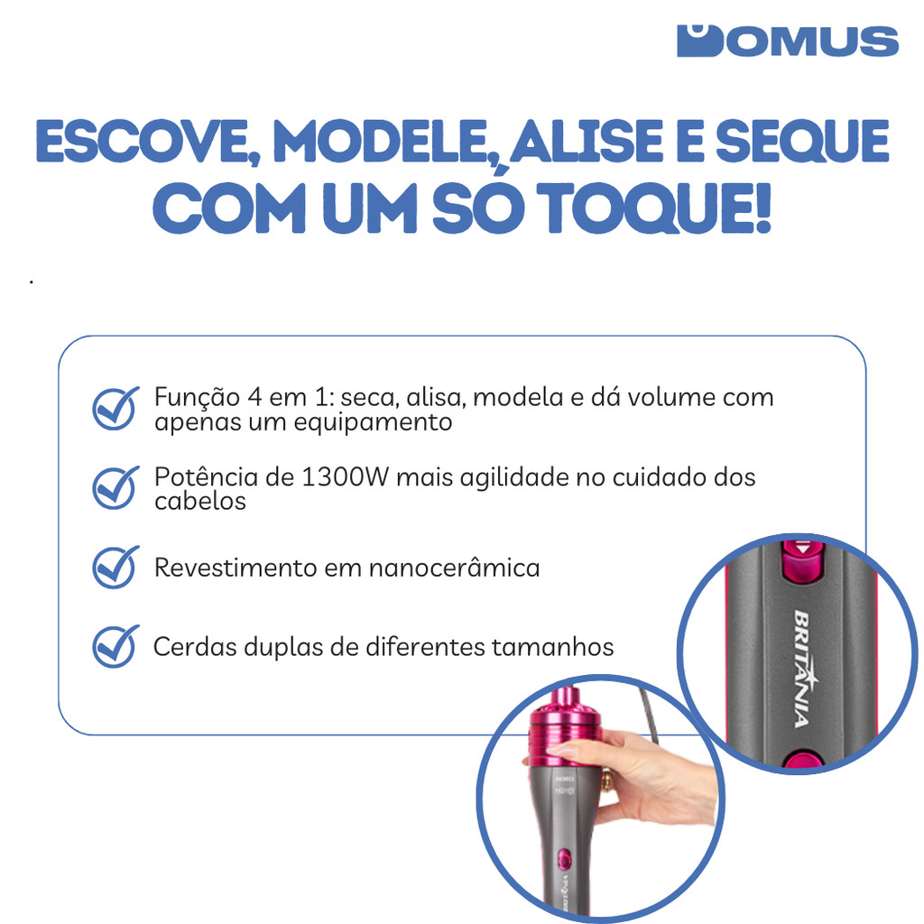 Escova Secadora Britânia 4 em 1 1300W - Seca, Alisa e Modela, Bivolt