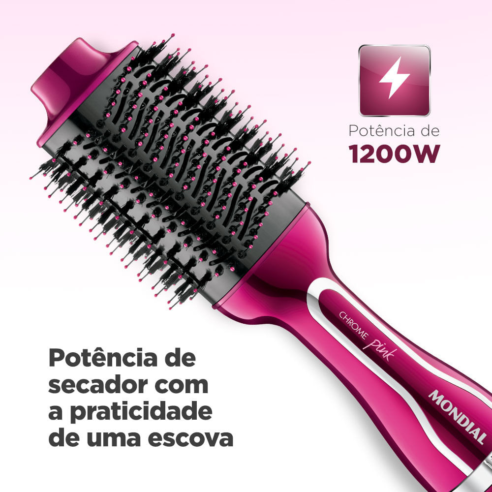 Uma rotina mais prática de cuidados com as mechas! A Escova Secadora Chrome Pink é 3 em 1: você seca, alisa e modela com uma única mão e deixa seu cabelo lindo em minutos. Além disso, a escova possui revestimento com Tourmaline Íon, tecnologia que reduz o frizz, dá brilho e maciez aos fios. Saiba mais sobre a ES-04 da Mondial: CERÂMICA + TOURMALINE ÍON: Tecnologia para cuidar da saúde dos seus cabelos! A escova tem revestimento em cerâmica e com Tourmaline, mineral que emite íons negativos ao ser ativado pelo calor. Os íons fecham as cutículas dos fios, deixando-os mais macios, brilhantes e sem frizz. ESCOVA 3 EM 1: Você seca, alisa e modela utilizando apenas um produto e com uma única mão. É muita praticidade! ALTA POTÊNCIA: São 1.200W para secar seu cabelo com rapidez e eficiência. DESIGN OVAL: FACILITA A ESCOVAÇÃO O formato da escova secadora é perfeito para alisar, além de também ser um aliado para quem quer dar volume às mechas. CERDAS MISTAS: Os formatos diferentes permitem alinhar e modelar o cabelo ao mesmo tempo. PONTA FRIA: A ponteira da escova Mondial não aquece e protege suas mãos durante o uso. 3 VARIAÇÕES DE TEMPERATURA: Ajuste a intensidade do calor de acordo com seu tipo de cabelo. CABO 360: O fio é giratório e não enrola durante o uso. Cabo embolado nunca mais!
