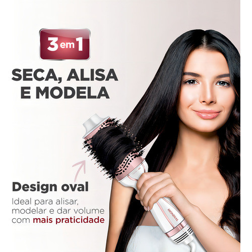 VOLTAGEM: Bivolt VOLTAGEM: Bivolt VOLTAGEM: Bivolt VOLTAGEM: Bivolt Escova Secadora Mondial White Rose ES-50 1300W A Escova Secadora Mondial ES-50 combina secador, escova e modelador em um único produto, oferecendo praticidade e resultado profissional no dia a dia. Com 1.300W de potência, ela seca, alisa e modela de forma rápida, reduzindo o frizz graças ao revestimento cerâmico com tecnologia Tourmaline Íon, que ajuda a selar as cutículas dos fios e aumentar o brilho. Seu design oval facilita a modelagem das pontas, e as cerdas mistas alinham e dão volume. Possui 3 níveis de temperatura e cabo giratório 360°, garantindo liberdade de movimento durante o uso. ESPECIFICAÇÕES DO PRODUTO: - Cor: Branco / Rose Gold - Material: Plástico resistente + revestimento cerâmico Tourmaline Íon - Voltagem: Bivolt (chaveado) - Potência: 1.300W - Níveis de temperatura: 3 - Funções extras: Seca, alisa e modela; tecnologia Tourmaline Íon; emissão de íons; cerdas mistas; cabo giratório 360° - Consumo de energia: ~1,3 kW/h - Dimensões aproximadas: 39 cm x 8,5 cm x 11 cm - Peso: 0,50 kg - Garantia: 12 meses - Marca: Mondial - Modelo: ES-50 ITENS INCLUSOS: 01 – Escova Secadora Mondial ES-50 01 – Manual do Usuário PALAVRAS-CHAVE: Escova secadora, Mondial ES-50, 1300W, Tourmaline Íon, Secar, Alisar, Modelar, 3 em 1, White Rose, Cabelos lisos, Cabelos brilhantes.