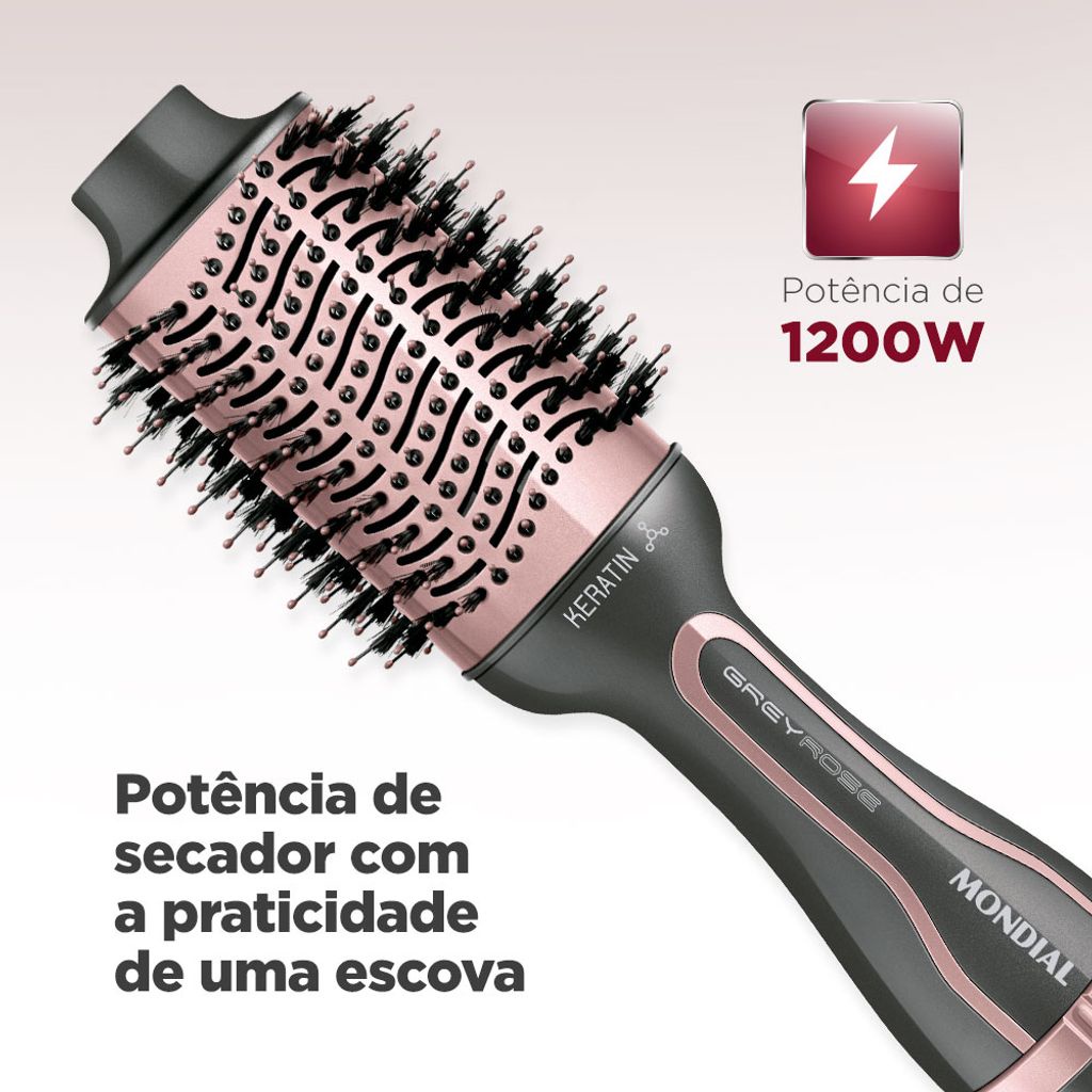 Seca, alisa e modela: a Escova Secadora Grey Rose Keratin proporciona resultado de salão e com a praticidade de usar uma única mão. Com 1.200W de potência para uma secagem rápida, a escova ainda conta com um revestimento cerâmico especial para cuidar da saúde dos fios. A queratina protege e dá brilho às mechas. Saiba mais sobre a ES-11-BI da Mondial: REVESTIMENTO CERÂMICO + QUERATINA: Tecnologia para cuidar da saúde dos fios: check! A escova tem revestimento em cerâmica e com queratina, que é uma proteína presente naturalmente nos cabelos. A queratina recupera a integridade do cabelo, melhora a elasticidade e dá brilho. ESCOVA 3 EM 1: Você seca, alisa e modela utilizando apenas um produto e com uma única mão. É muita praticidade! BIVOLT CHAVEADO: Ajuste a chave seletora e use a Escova Secadora Mondial em tomadas 127V e 220V. ALTA POTÊNCIA: São 1.200W para secar seu cabelo com rapidez e eficiência. DESIGN OVAL: FACILITA A ESCOVAÇÃO O formato da escova secadora é perfeito para alisar, além de também ser um aliado para quem quer dar volume às mechas. 3 VARIAÇÕES DE TEMPERATURA: Ajuste a intensidade do calor de acordo com seu tipo de cabelo. CERDAS MISTAS: Os formatos diferentes permitem alinhar e modelar o cabelo ao mesmo tempo. PONTA FRIA: A ponteira da escova Mondial não aquece e protege suas mãos durante o uso. CABO 360°: O fio é giratório e não enrola durante o uso. Cabo embolado nunca mais!