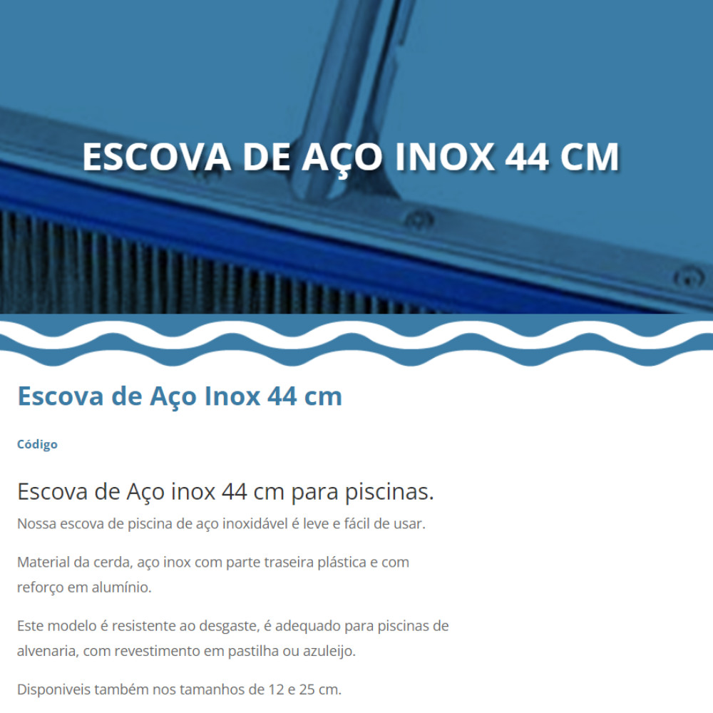 | ESCOVÃO DE AÇO 44CM PARA LIMPEZA DO AZULEJO DE PISCINAS E SPA DE AL... este produto | R$ 140,95 | 6% | 4.9/5 | 6 |