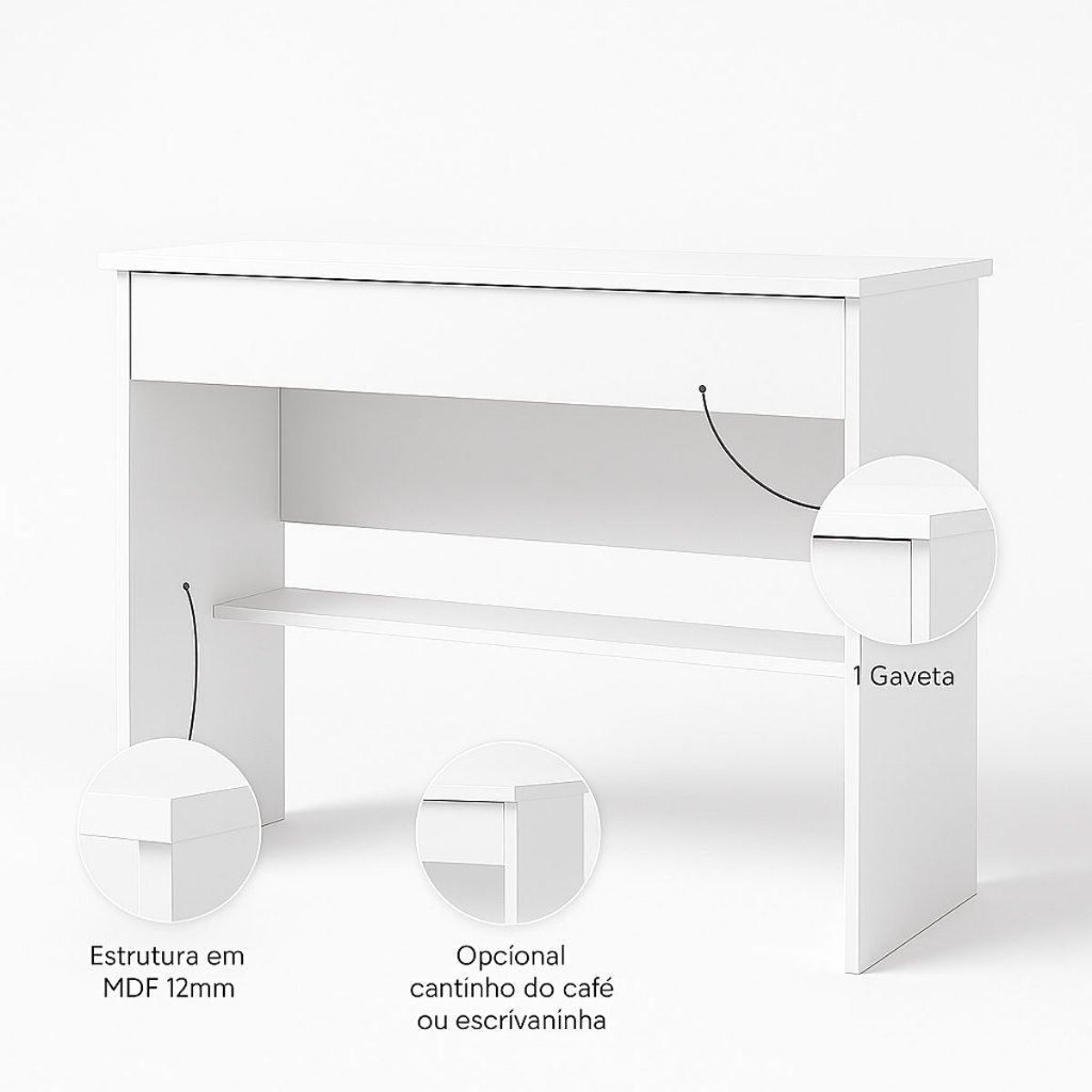🪑 Escrivaninha com Gaveta Compacta – Mesa de Estudo e Computador para Home Office Organize seu espaço com estilo e praticidade com a Escrivaninha Compacta com Gaveta, perfeita para quem busca um ambiente de estudos ou trabalho moderno e funcional. Com design minimalista e estrutura reforçada, ela é ideal para quartos, escritórios ou home office, oferecendo conforto e elegância no dia a dia. Fabricada com materiais de alta qualidade, essa mesa combina resistência, utilidade e beleza, adaptando-se facilmente a qualquer estilo de decoração. 🌟 CARACTERÍSTICAS DO PRODUTO Estrutura em MDP de alta densidade, garantindo resistência e estabilidade 1 gaveta espaçosa para guardar documentos, cadernos e materiais de escritório Acabamento em pintura UV, que protege contra umidade e facilita a limpeza Design compacto e moderno, ideal para ambientes pequenos Pés firmes que proporcionam segurança e durabilidade Versátil: pode ser usada como mesa de estudos, computador, maquiagem ou apoio 📏 DIMENSÕES DO PRODUTO MONTADO Altura: 78,5 cm Largura: 70,5 cm Profundidade: 40 cm Peso: 5 kg 💎 BENEFÍCIOS ✅ Compacta e funcional – aproveita melhor o espaço ✅ Gaveta embutida para mais organização ✅ Ideal para estudo, trabalho ou decoração ✅ Estrutura reforçada com excelente durabilidade ✅ Design clean que combina com qualquer ambiente 📦 O QUE VEM NA EMBALAGEM 01 Escrivaninha com gaveta Kit ferragens completo Manual de montagem ⚙️ INFORMAÇÕES IMPORTANTES Produto entregue desmontado Montagem sob responsabilidade do comprador (recomendamos profissional especializado) Limpeza: pano úmido e sabão neutro, sem produtos abrasivos Cores e tons podem variar conforme iluminação ou tela do dispositivo Certifique-se das medidas antes da compra ❓ PERGUNTAS FREQUENTES 1. A escrivaninha vem montada? R: Não, o produto é entregue desmontado, mas acompanha manual e kit de montagem simples. 2. A gaveta é espaçosa? R: Sim, ela comporta facilmente cadernos, papéis, canetas e pequenos acessórios de escritório. 3. Suporta computador e monitor? R: Sim, a estrutura é firme e suporta o uso diário com notebook ou monitor leve. 4. O material é resistente à umidade? R: Sim, a pintura UV protege o móvel e facilita a limpeza.