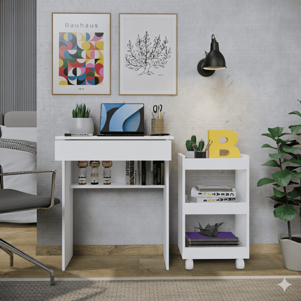 Pronta Entrega - Envio Imediato - Mais Vendido - Enviamos para Todo o Brasil Este conjunto para escritório inclui uma Escrivaninha compacta com gaveta e um Armário para Livros com 3 prateleiras e 4 rodinhas, ideal para organizar seu espaço com estilo e praticidade. Perfeito para o home office, quartos ou salas, oferece tudo o que você precisa para trabalhar ou estudar de forma organizada. Dimensões Carrinho Auxiliar Para Livros: - Largura: 38,5 cm - Altura: 65,5 cm - Profundidade: 29,3 - Perfeito Para Organizar o que você precisar com fácil acesso e onde você desejar. - Suporta 15 Kgs Distribuídos. - Fácil de limpar. Dimensões da Escrivaninha: - Altura: 79cm - Largura: 68cm - Profundidade: 37cm Características: - Material resistente: MDP Uma gaveta espaçosa para organização - Suporta até 20kg distribuídos Ideal para manicures, estudantes e pequenos espaços. - Fácil de Montar Ideal Para Utilizar em: - Salão De Beleza - Escritório - Quarto - Sala - Entre muitos outros ambientes.